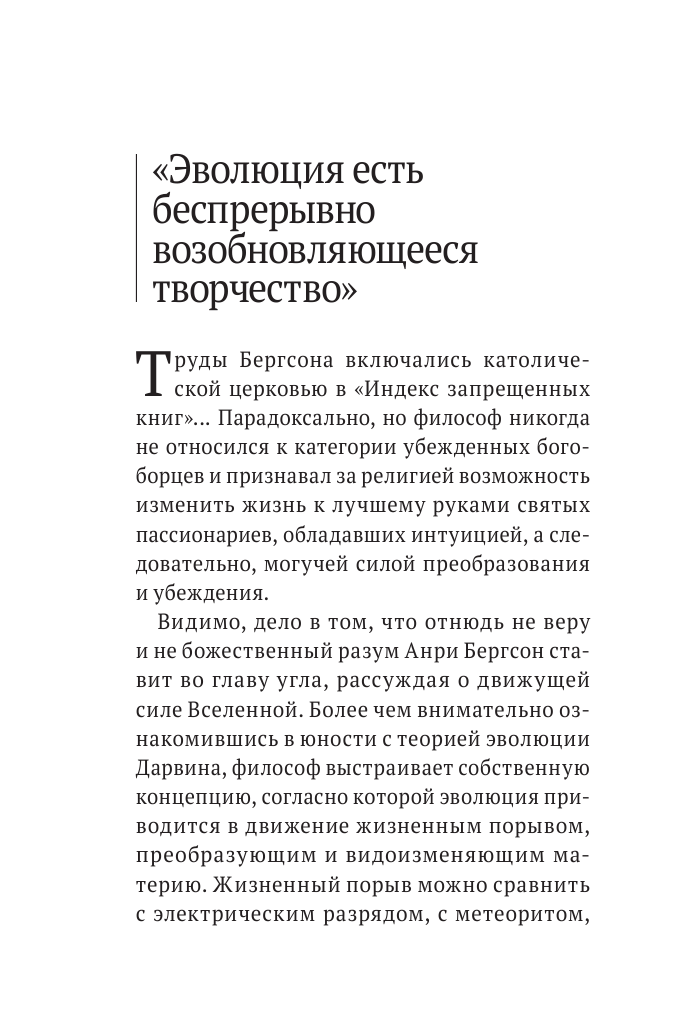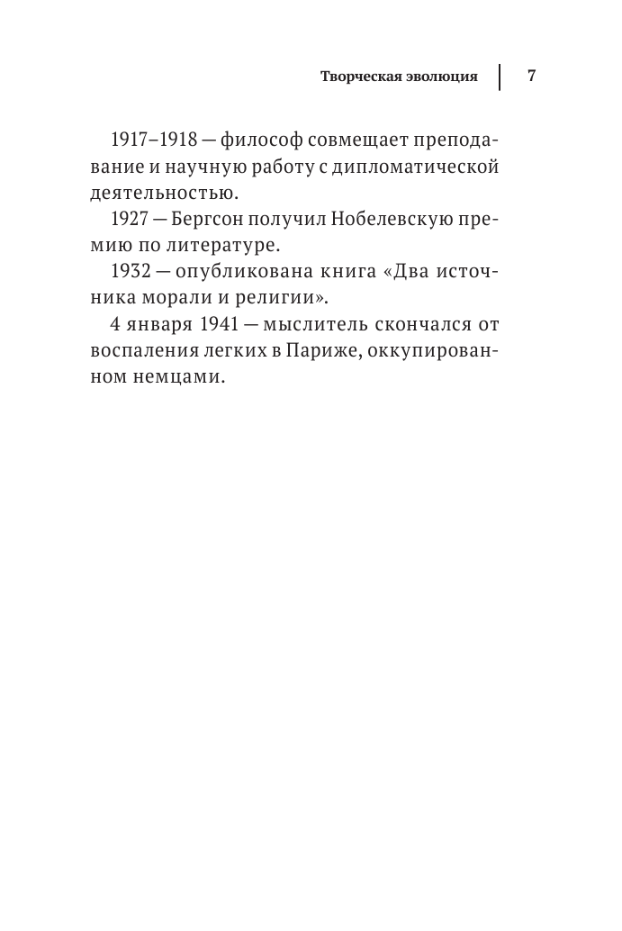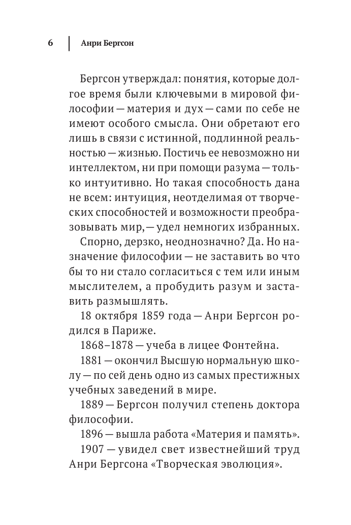Уже купив и начав читать я узнал что в книге только 2 первых главы книги Бергсона. Я не понял зачем вообще публиковать только часть текста. При описании на сайте этой информации не было. Просьба к магазину, можно при описании публиковать полную информацию, т к я не вижу что я покупаю.