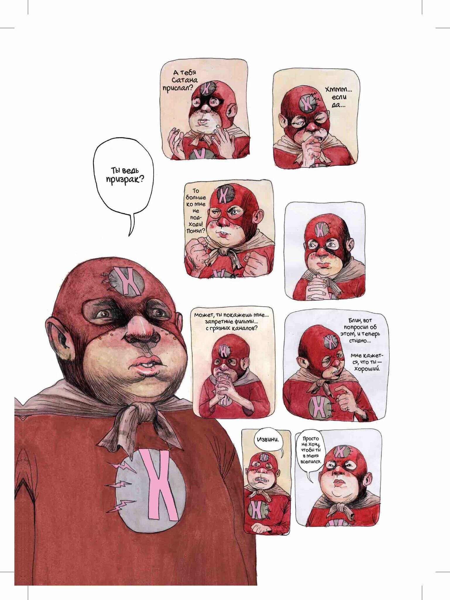 Графический роман с уникальной рисовкой и чокнутым сюжетом, который как будто вечно ломает сам себя. События сбивчивы: тут и воинствующие подростки в постапокалиптическом мире, и магия, и инопланетяне, и демоны, и нелепый трогательный мальчишка, который хочет быть героем, и автор-творец всего плохого и хорошего, кошмары которого питают монстров, а идеалы порождают крутых борцов за мир. В суматохе сюжета мелькают личные эмоции, философские рассуждения об одиночестве и смерти, победе над страхом и вечные намёки на присутствие автора. Да что там, не намёки даже, а прямые заявления: «тебе ни разу не приходило в голову, что ты все это придумал?». В общем, это комикс о комиксе, напичканный мальчишескими фантазиями, личными страхами, переживаниями о творчестве и жизни, так что не ждите, что чтение будет сладким погружением в выдуманный мир: вас постоянно будет выбрасывать в реальность. Вообще, складывается ощущение, что автор рисовал сам для себя, не слишком заботился о читателях. Просто следовал своим порывам. Что то вроде: «Вот тут будет крутая драка, а тут мне грустно, а тут я понял что-то важное и хочу об этом сказать, а тут мои герои просто классные, ну а тут мы вроде бы сведём концы сюжета, хоть это и не так важно, важен процесс.» Хорошо это или плохо - не знаю. Мне было забавно, хоть и без откровений. Рефлексия автора мне откликнулась.