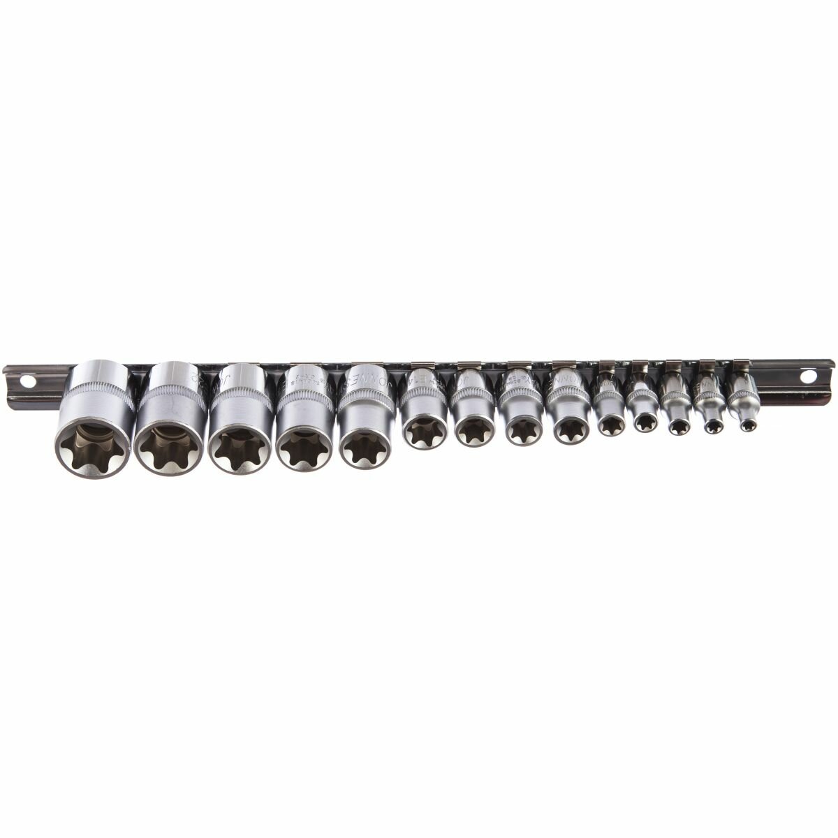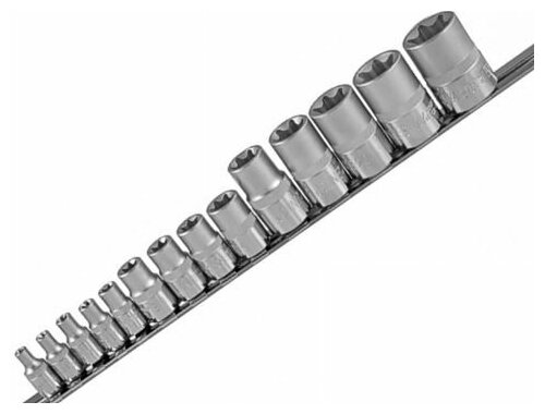 | Комплектация | - 1/4"DR- Головки торцевые внешний Torx, 5 шт.Е4, Е5, Е6, Е7, Е8; - - 3/8"DR- Головки торцевые внешний Torx, 4 шт.Е10, Е11, Е12, Е14; - - 1/2"DR- Головки торцевые внешний Torx, 5 шт.Е16, Е18, Е20, Е22, Е24. - - Держатель "рельс". |