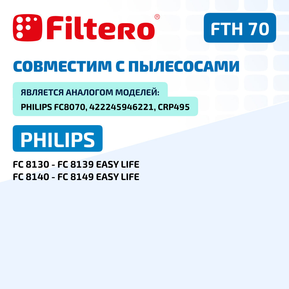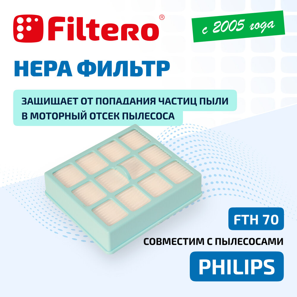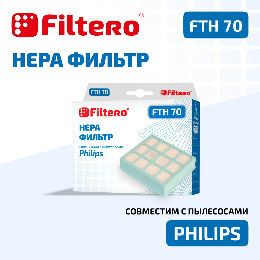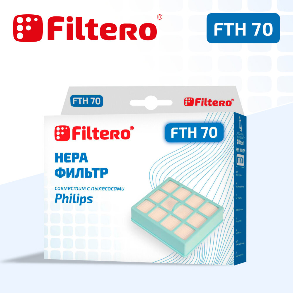| Прочие особенности и свойства | Немоющийся фильтр Filtero FTH 70 уровня фильтрации НЕРА Н 12 препятствует выходу мельчайших частиц пыли и аллергенов из пылесоса в помещение. Он подлежит замене согласно рекомендации производителя пылесосов - не реже одного раза за 6 месяцев. |