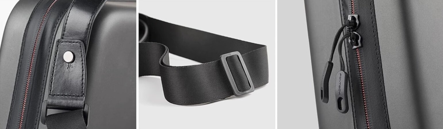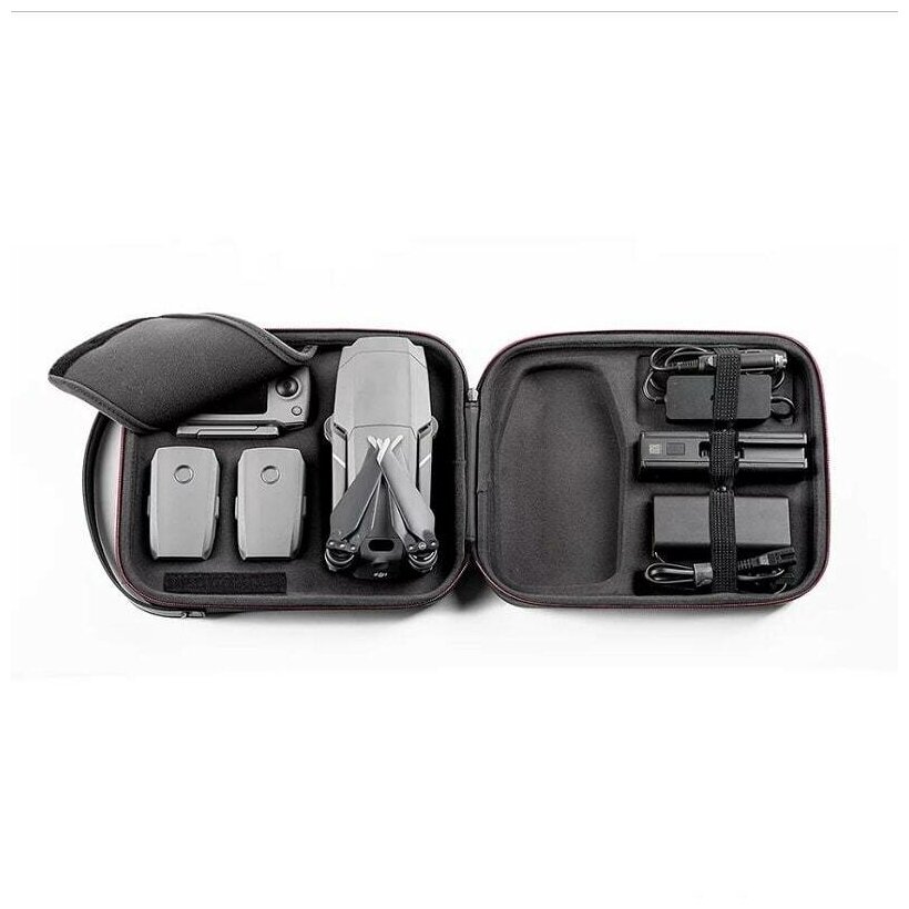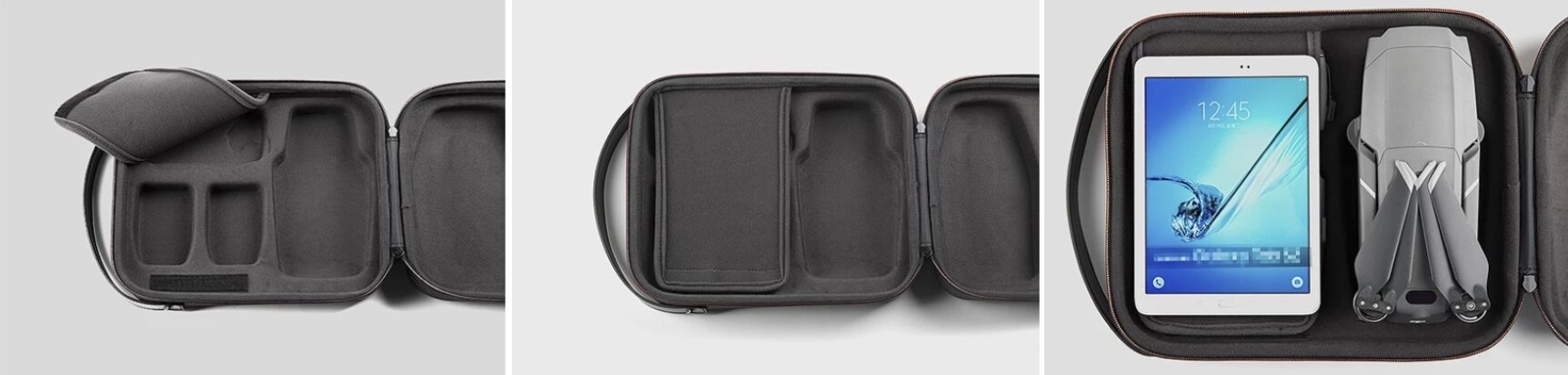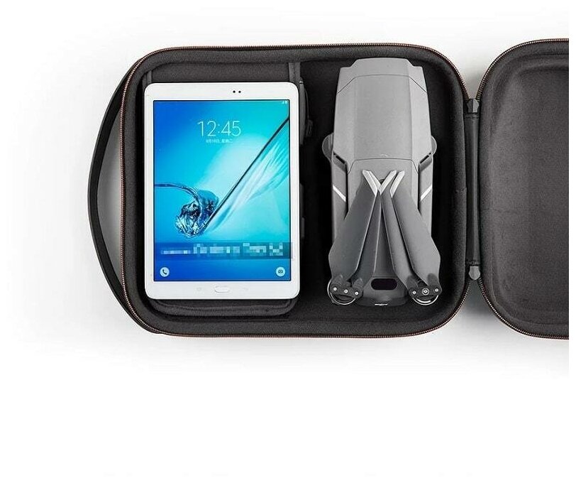 Имея внешне небольшие размеры, внутренняя часть жесткой сумки-кейса может вместить квадрокоптер, до 5 аккумуляторов, зарядное устройство с кабелями, автомобильную зарядку и 7.9 дюймовый планшет. Прорезиненные замки вместе с внешней полиуретановой тканью делают возможной защиту от пыли, грязи и даже дождя.