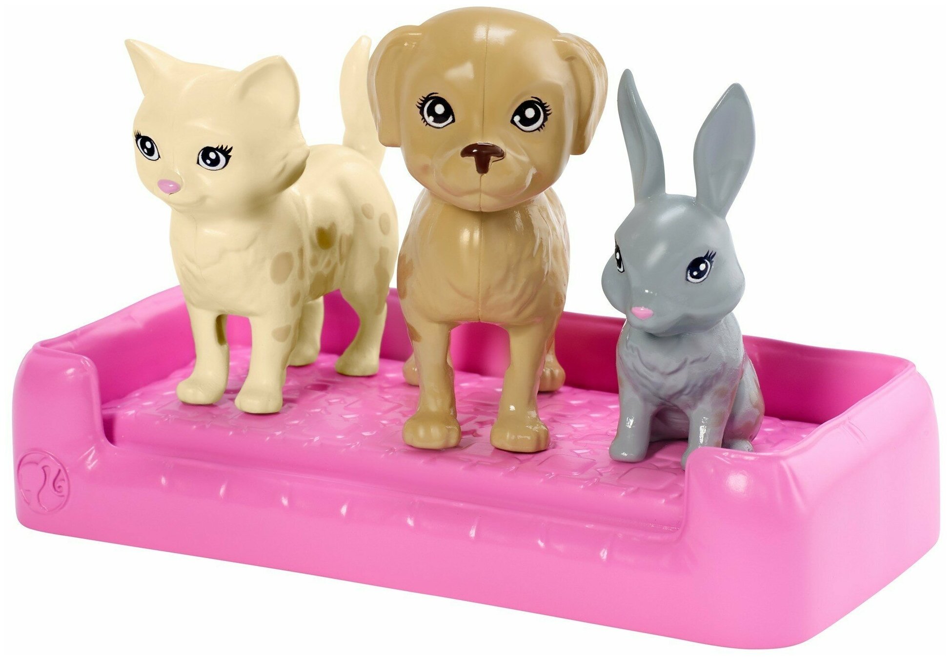 Ваша маленькая принцесса обожает животных? Тогда она будет в восторге от этого замечательного набора! В него входят три питомца - щенок, котенок и кролик - и более 10 аксессуаров для ухода за ними, включая три миски для еды и три уникальных лакомства (косточку, рыбку и морковку). Наполните зеленую игровую емкость холодной водой и наблюдайте, как животные "пачкаются" в траве, а затем поместите их в таз с горячей водой и смойте с них все пятнышки! Кукла Барби одета в стильный наряд и кроссовки. В игре с этим набором вашу малышку ждет столько новых открытий!