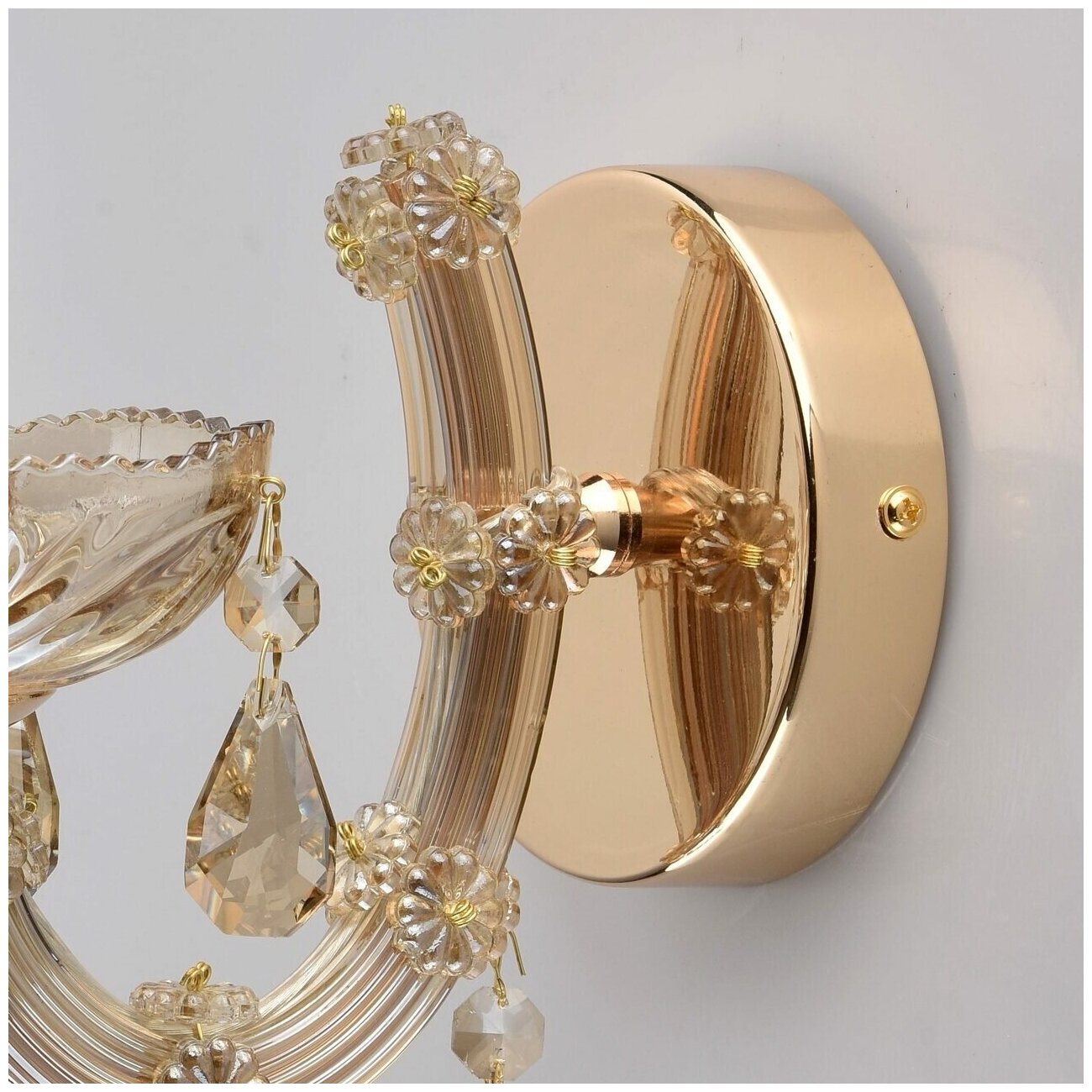 Изысканный и нежный настенный светильник из коллекции «Одетта» станет отличным дополнением к классическому интерьеру дома или ресторана. Металлическое основание окрашено под золото. Прочная рельефная дуга украшена небольшими хрустальными декоративными элементами в виде цветов, а со светильника вниз свисают крупные подвески-капли. Светильник выглядит удивительно роскошным и ярким. На прозрачном хрустальном блюдце, украшенном рельефными узорами, высится лампа накаливания, словно старинная свеча. С таким светильником приятно отдохнуть после тяжёлого дня.