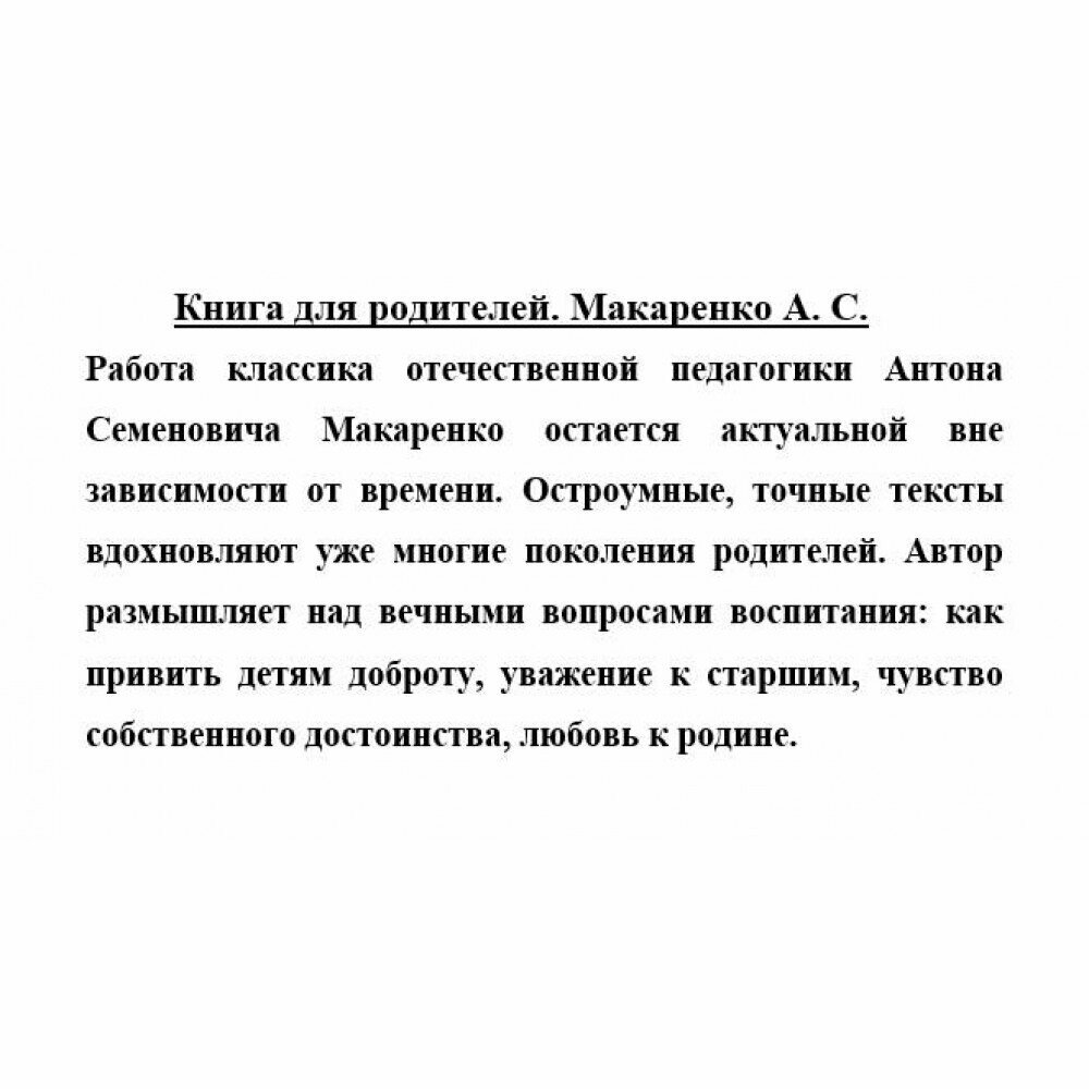 Работа классика отечественной педагогики Антона Семеновича Макаренко остается актуальной вне зависимости от времени. Остроумные, точные тексты вдохновляют уже многие поколения родителей. Автор размышляет над вечными вопросами воспитания: как привить детям доброту, уважение к старшим, чувство собственного достоинства, любовь к родине.