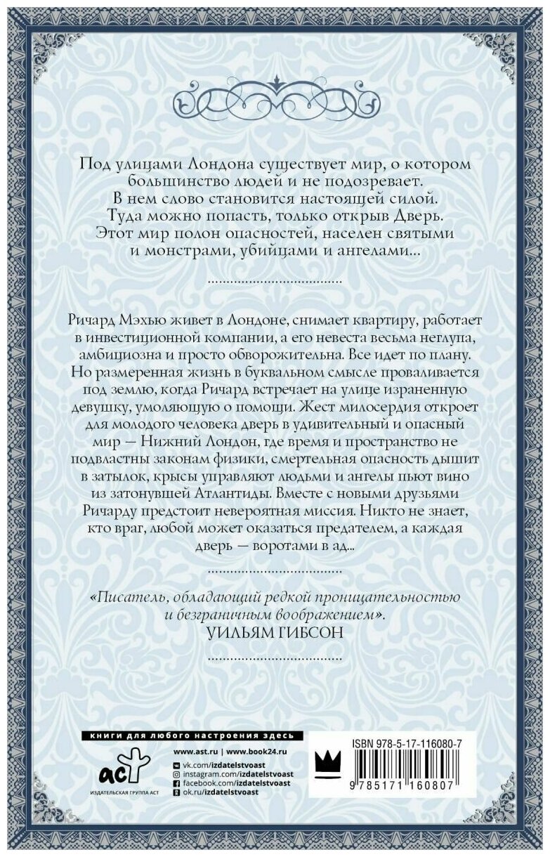 Ричард Мэхью живет в Лондоне, снимает квартиру, работает в инвестиционной компании, а его невеста весьма неглупа, амбициозна и просто обворожительна. Все идет по плану. Но размеренная жизнь в буквальном смысле проваливается под землю, когда Ричард встречает на улице израненную девушку, умоляющую о помощи. Жест милосердия откроет для молодого человека дверь в удивительный и опасный мир — Нижний Лондон, где время и пространство не подвластны законам физики, смертельная опасность дышит в затылок, крысы управляют людьми и ангелы пьют вино из затонувшей Атлантиды. Вместе с новыми друзьями Ричарду предстоит невероятная миссия. Никто не знает, кто враг, любой может оказаться предателем, а каждая дверь — воротами в ад...