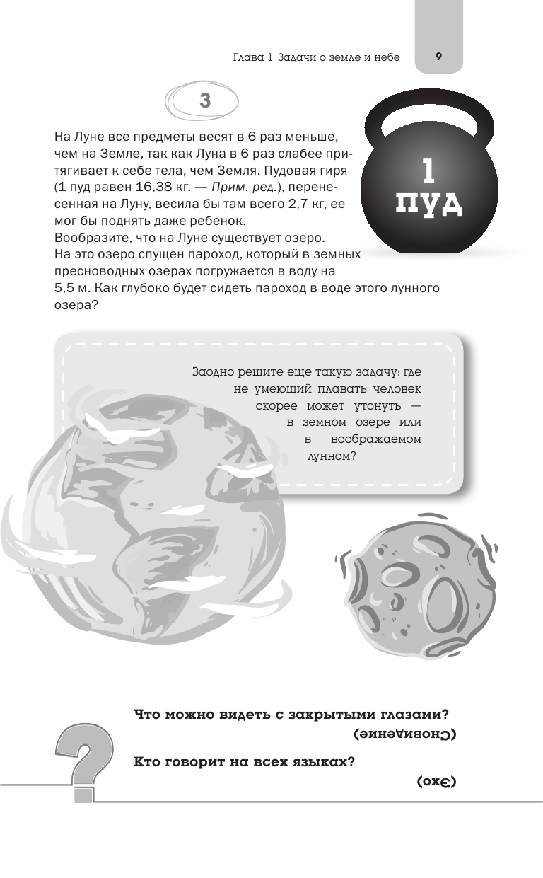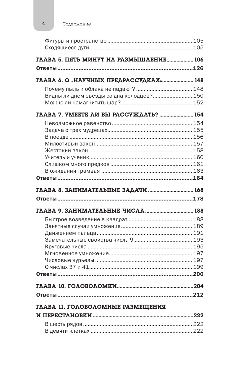 Прекрасная книга прекрасного автора! Была куплена для ребенка 10 лет интересующегося математикой. Но оказалась чрезвычайно интересной и для его родителей. Мы пока только начали погружаться в мир Якова Перельмана, но уже испытываем восторг. Замечательное пособие для развития логики у людей всех возрастов. Обложка твердая, печать черно-белая, бумага хорошая. Содержит 18 глав, после каждой главы идут подробные ответы. Покупкой вполне довольна!