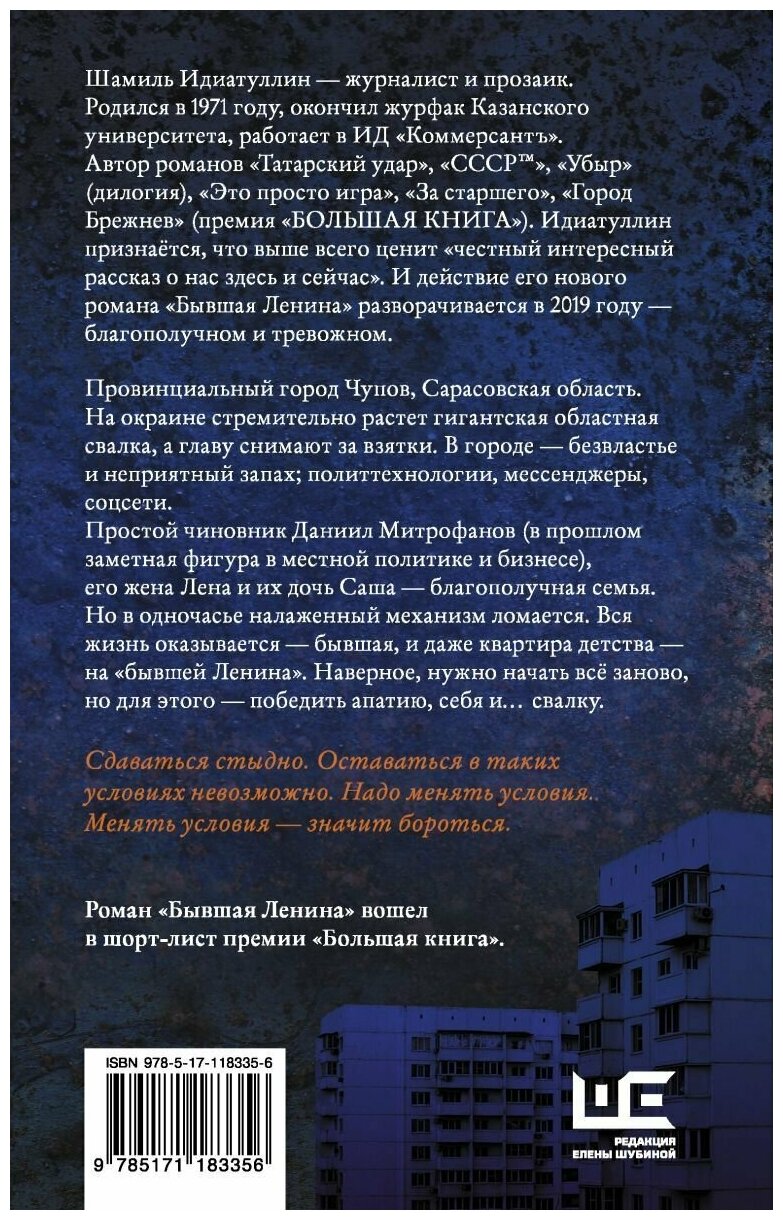 Шамиль Идиатуллин — журналист и прозаик. Родился в 1971 году, окончил журфак Казанского университета, работает в ИД «Коммерсантъ». Автор романов «Татарский удар», «СССР™», «Убыр» (дилогия), «Это просто игра», «За старшего», «Город Брежнев» (премия «БОЛЬШАЯ КНИГА»). Идиатуллин признаётся, что выше всего ценит «честный интересный рассказ о нас здесь и сейчас». И действие его нового романа "Бывшая Ленина" разворачивается в 2019 году — благополучном и тревожном. Провинциальный город Чупов, Сарасовская область. На окраине стремительно растет гигантская областная свалка, а главу снимают за взятки. В городе — безвластье и неприятный запах; политтехнологии, мессенджеры, соцсети. Простой чиновник Даниил Митрофанов (а в прошлом заметная фигура в местной политике и бизнесе), его жена Лена и их дочь Саша — благополучная семья. Но в одночасье налаженный механизм ломается. Вся жизнь оказывается — бывшая, и даже квартира детства — на «бывшей Ленина». Наверное, нужно начать всё заново, но для этого — победить апатию, себя и… свалку. Сдаваться стыдно. Оставаться в таких условиях невозможно. Надо менять условия. Менять условия — значит бороться.