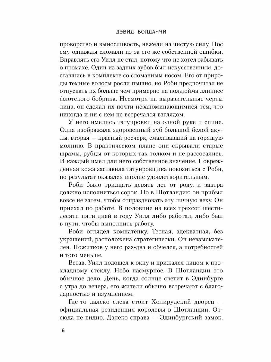 Все детективы и триллеры Болдаччи стали бестселлерами. Но серия о Уилле Роби – самая популярная и любимая миллионами читателей по всему миру, по-настоящему запавших на ее главного героя – настоящего мужчину с несгибаемым характером и стальными мускулами, но при этом с нежным и горячим сердцем, остро реагирующим на несправедливость. Уилл Роби – лучший ликвидатор на службе у правительства. Его дело – без сомнений и угрызений совести приводить в исполнение неофициальные смертные приговоры врагам государства. Но вот однажды Роби совершил то, о чем до этого даже помыслить не мог. Выйдя на цель, он не спустил курок. Ведь "целью" оказалась молодая женщина с двумя маленькими детьми…