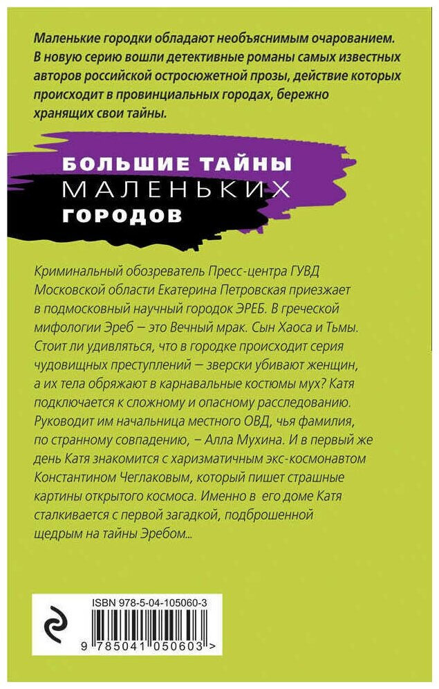Криминальный обозреватель Пресс-центра ГУВД Московской области Екатерина Петровская приезжает в подмосковный научный городок ЭРЕБ. В греческой мифологии Эреб - это Вечный мрак. Сын Хаоса и Тьмы. Стоит ли удивляться, что в городке происходит серия чудовищных преступлений - зверски убивают женщин, а их тела обряжают в карнавальные костюмы мух? Катя подключается к сложному и опасному расследованию. Руководит им начальница местного ОВД, чья фамилия, по странному совпадению, - Алла Мухина. И в первый же день Катя знакомится с харизматичным экс-космонавтом Константином Чеглаковым, который пишет страшные картины открытого космоса. Именно в его доме Катя сталкивается с первой загадкой, подброшенной щедрым на тайны Эребом.