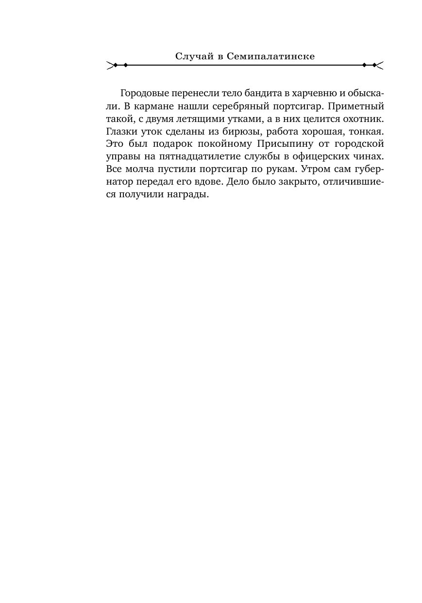 Признаюсь, что люблю детективы Свечина. Читаются легко. Много интересных фактов. Случай в Семипалатинске не исключение. Из минусов- рисунки оставляют желать лучшего. Есть опечатки. И самое важное- адмирала Рожественского упорно именуют Рождественским. По чьей вине, думаю автор разберется!