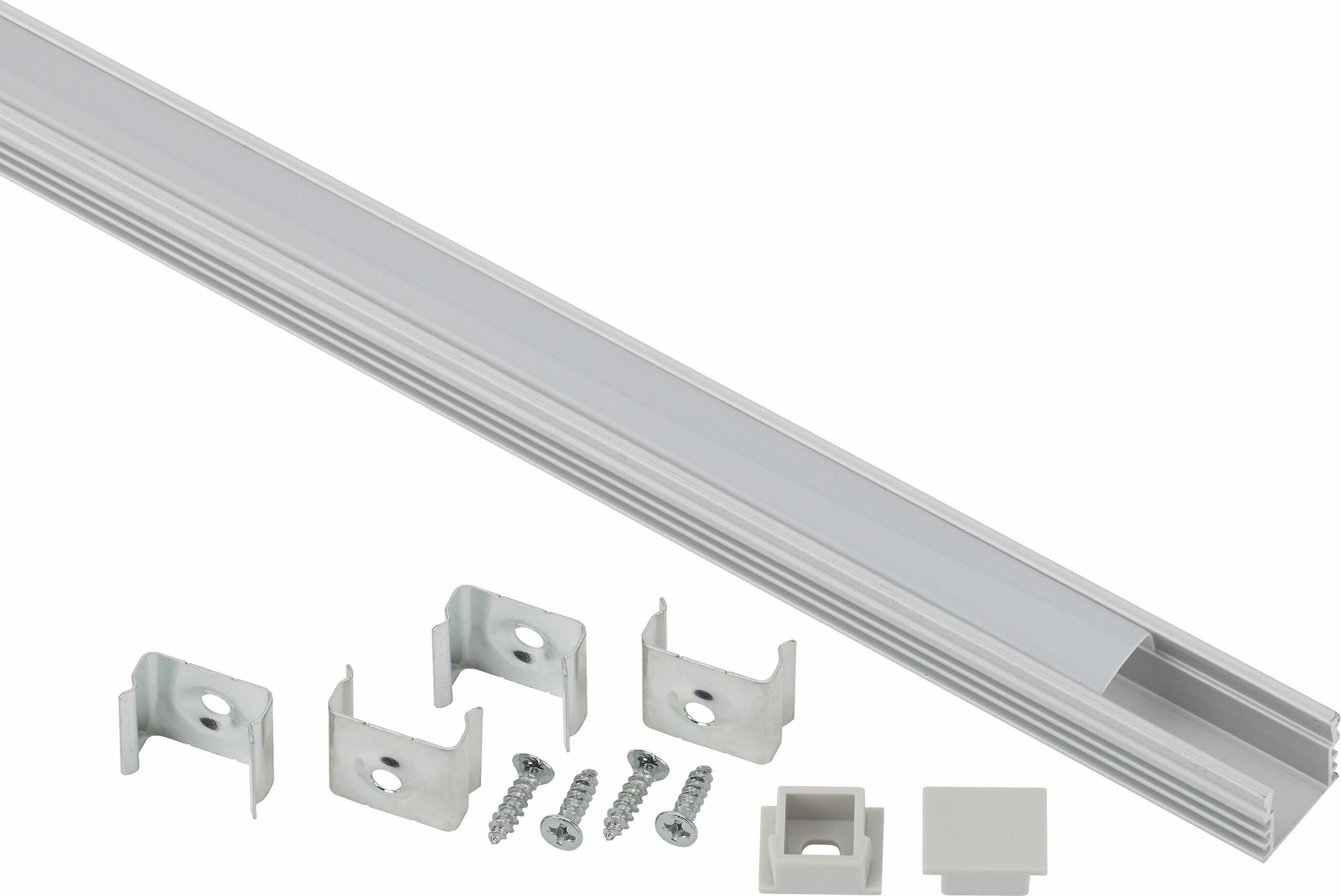Комплект предназначен для установки светодиодных лент. За счёт отведения тепла работающих светодиодов увеличивает срок службы ленты. Анодированное покрытие обеспечивает устойчивость к воздействиям окружающей среды, обеспечивает гладкость и легко окрашивается. Эстетично смотрится в интерьере, обеспечивает механическую защиту. В комплекте накладной анодированный профиль CAB261 16х12 мм, 2 м, защитный экран 2 м, 4 крепления и 2 заглушки.