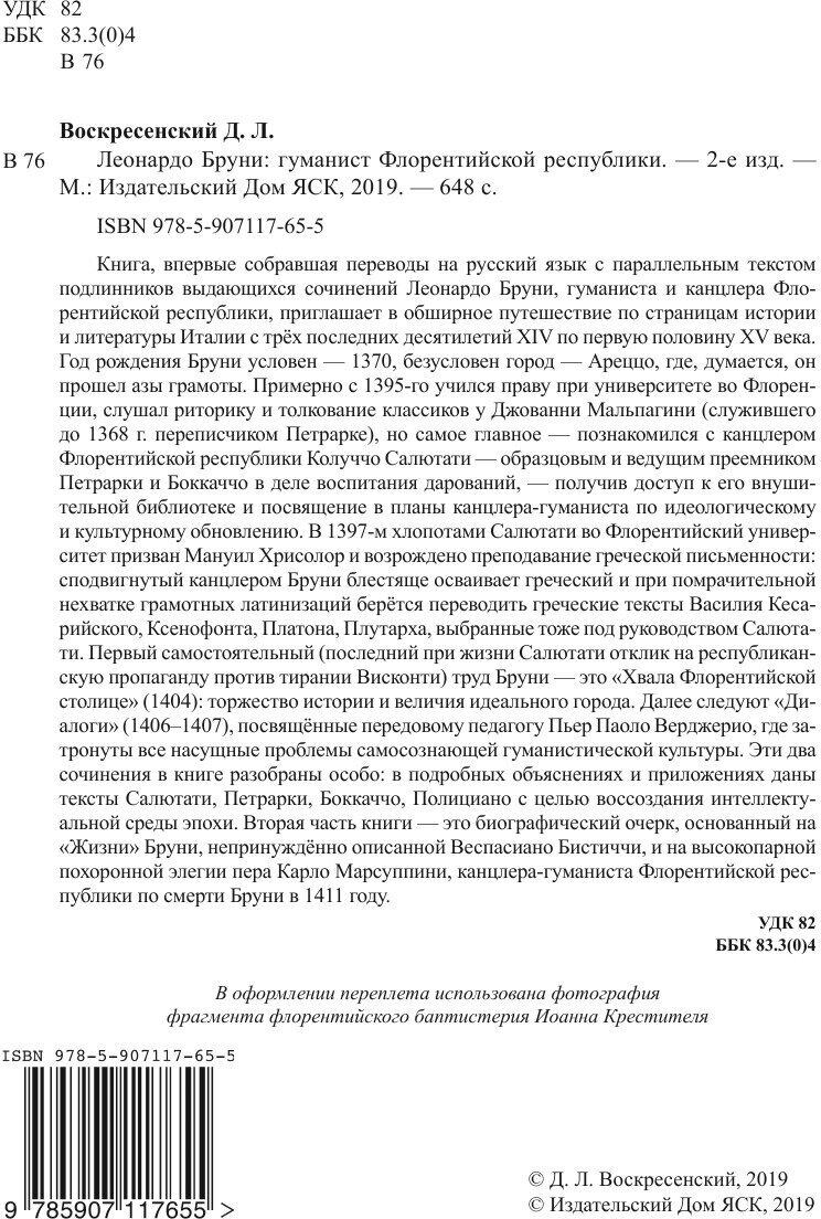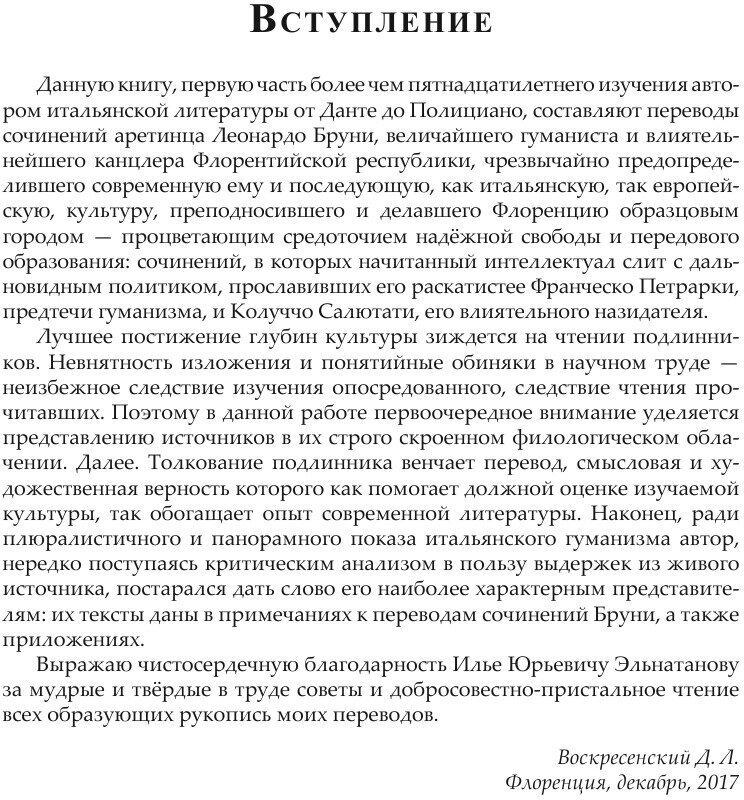 Книга, впервые собравшая переводы на русский язык с параллельным текстом подлинников выдающихся сочинений Леонардо Бруни, гуманиста и канцлера Флорентийской республики, приглашает в обширное путешествие по страницам истории и литературы Италии с трёх последних десятилетий XIV по первую половину XV века. Год рождения Бруни условен - 1370, безусловен город - Ареццо, где, думается, он прошёл азы грамоты. Примерно с 1395-го учился праву при университете во Флоренции, слушал риторику и толкование классиков у Джованни Мальпагини (служившего до 1368 г. переписчиком Петрарке), но самое главное - познакомился с канцлером Флорентийской республики Колуччо Салютати - образцовым и ведущим преемником Петрарки и Боккаччо в деле воспитания дарований, - получив доступ к его внушительной библиотеке и посвящение в планы канцлера-гуманиста по идеологическому и культурному обновлению. В 1397-м хлопотами Салютати во Флорентийский университет призван Мануил Хрисолор и возрождено преподавание греческой письменности: сподвигнутый канцлером Бруни блестяще осваивает греческий и при помрачительной нехватке грамотных латинизаций берётся переводить греческие тексты Василия Кесарийского, Ксенофонта, Платона, Плутарха, выбранные тоже под руководством Салютати. Первый самостоятельный (последний при жизни Салютати отклик на республиканскую пропаганду против тирании Висконти) труд Бруни - это "Хвала Флорентийской столице" (1404): торжество истории и величия идеального города. Далее следуют "Диалоги" (1406-1407), посвящённые передовому педагогу Пьер Паоло Верджерио, где затронуты все насущные проблемы самосознающей гуманистической культуры. Эти два сочинения в книге разобраны особо: в подробных объяснениях и приложениях даны тексты Салютати, Петрарки, Боккаччо, Полициано с целью воссоздания интеллектуальной среды эпохи. Вторая часть книги - это биографический очерк, основанный на "Жизни" Бруни, непринуждённо описанной Веспасиано Бистиччи, и на высокопарной похоронной элегии пера Карло Марсуппини, канцлера-гуманиста Флорентийской республики по смерти Бруни в 1411 году.