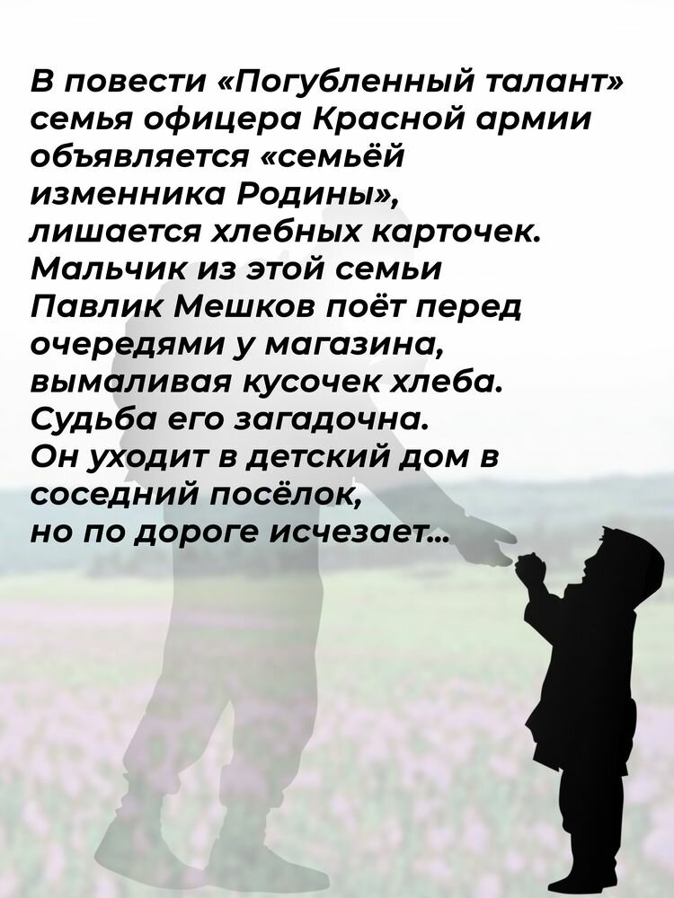 События происходят в глубоком сибирском тылу во время Великой Отечественной войны. В рассказе "Начало войны" сообщение о ней настолько потрясает душу восьмилетнего мальчика, что он на всю жизнь запоминает подробности первых дней войны. В повести "Погубленный талант" офицер Красной армии попадает в плен, а его родные объявляются "семьей изменника Родины", лишаются хлебных карточек и вынуждены бедствовать. Мальчик из этой семьи Павел Мешков обладает замечательным голосом и поёт перед очередями у магазина, вымаливая кусочек хлеба. Судьба его загадочна. Он уходит в детский дом в соседний поселок, но по дороге исчезает...