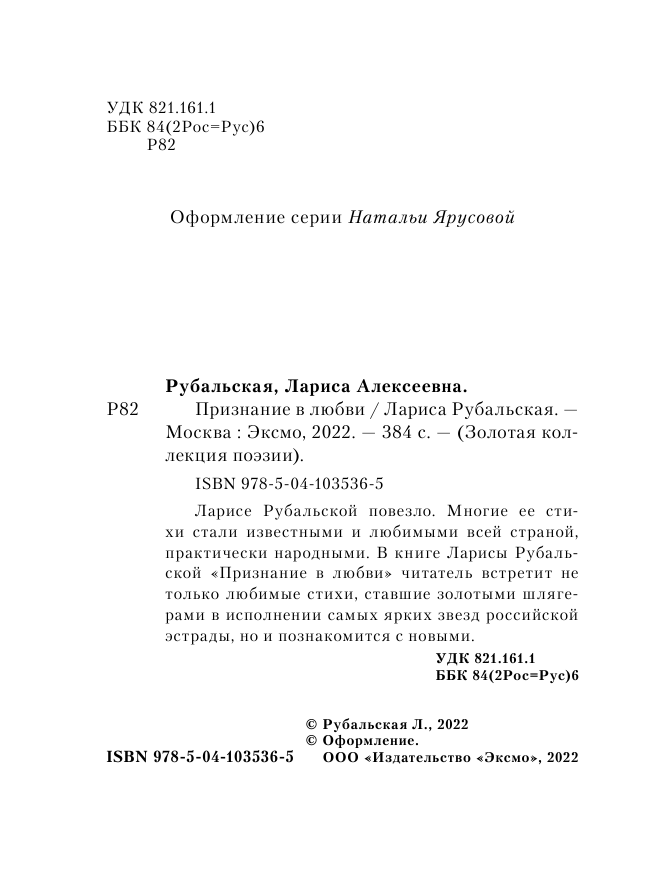 Книга: Признание в любви (Лариса Алексеевна Рубальская); Эксмо, 2022