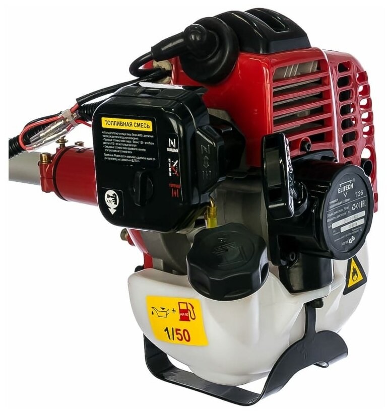 Триммер ELITECH Т26 оснащен 2-х тактным двигателем мощностью 1.0 л.с. Для более легкого запуска двигателя предусмотрен праймер и удобный стартер. Система воздушного охлаждения предотвращает перегрев внутренних органов инструмента. Защитный кожух предотвращает попадание скошенной травы на оператора. Антивибрационная система, состоящая из резинового виброизолятора, увеличивает комфорт при длительной работе.