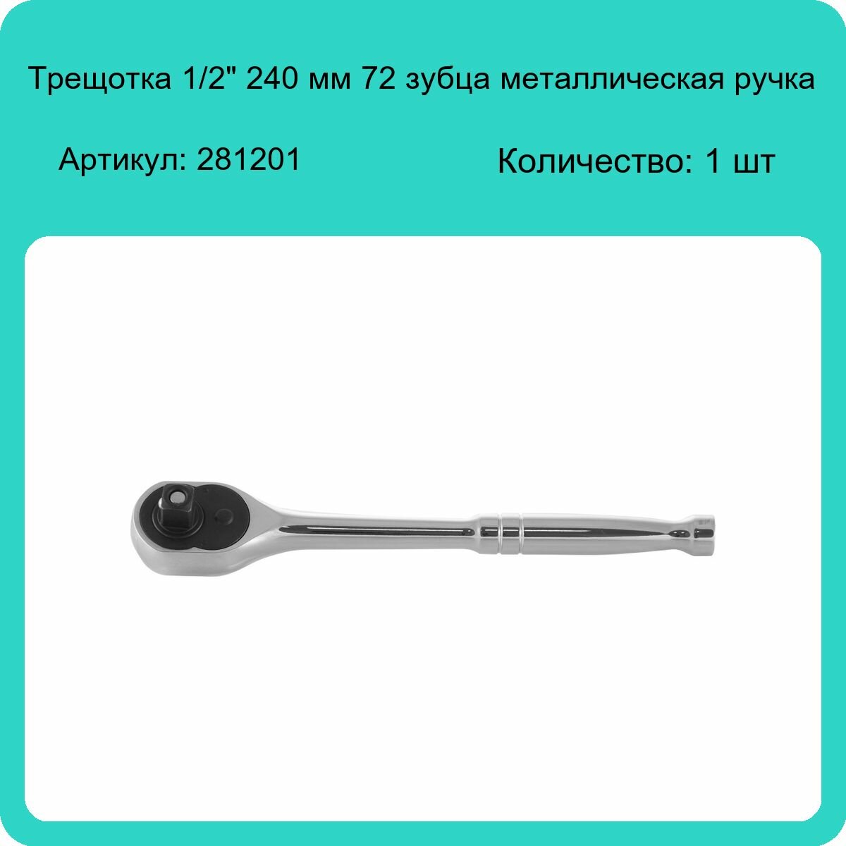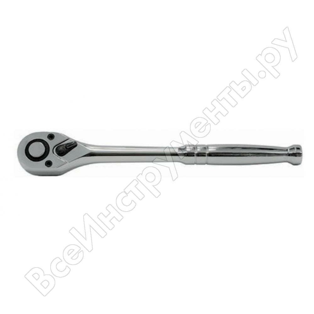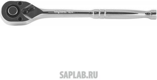 Трещоточная рукоятка с флажковым переключателем и металлической ручкой. Зеркальное хромоникелевое покрытие. Храповое колесо в 72 зубца, обеспечивающее 5° свободного хода и увеличенное пятно контакта храпового механизма, гарантирует большой запас прочности при высоком моменте.