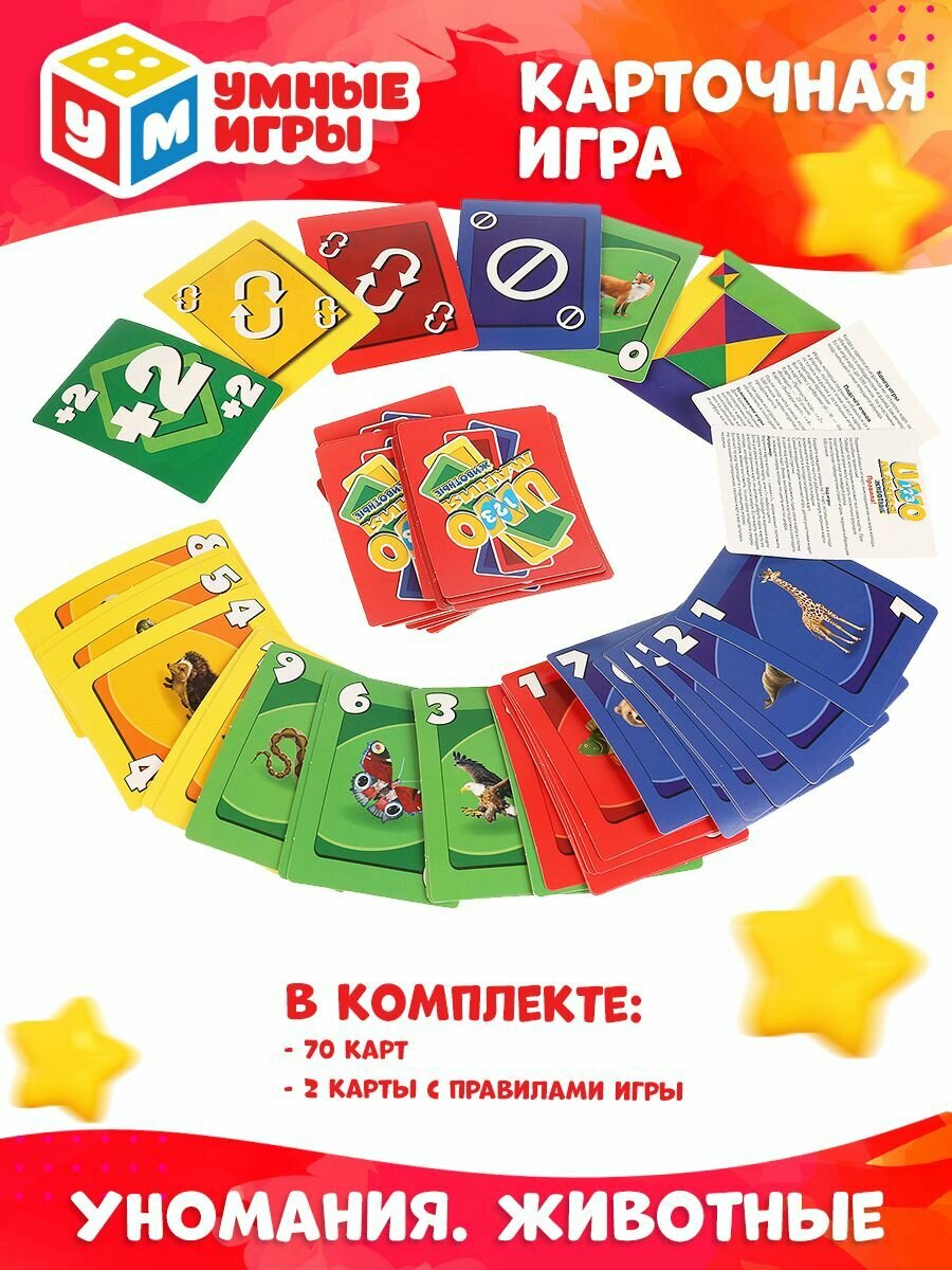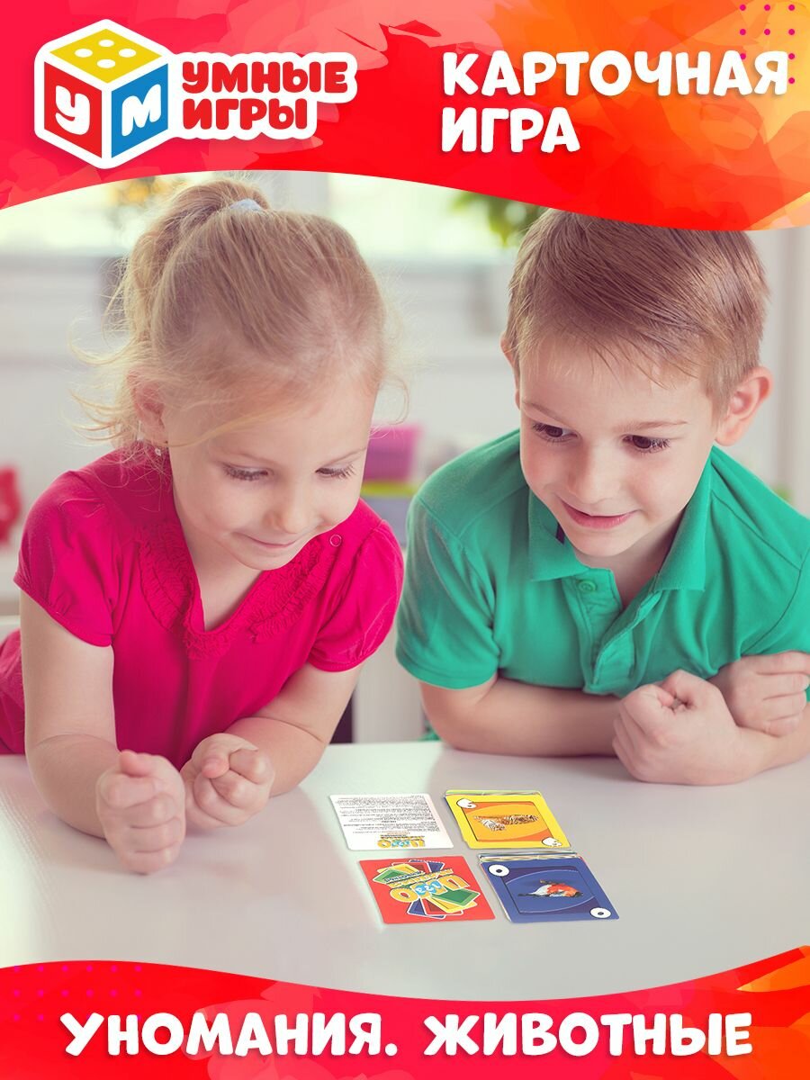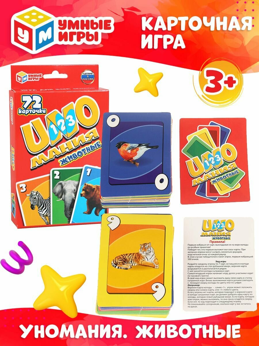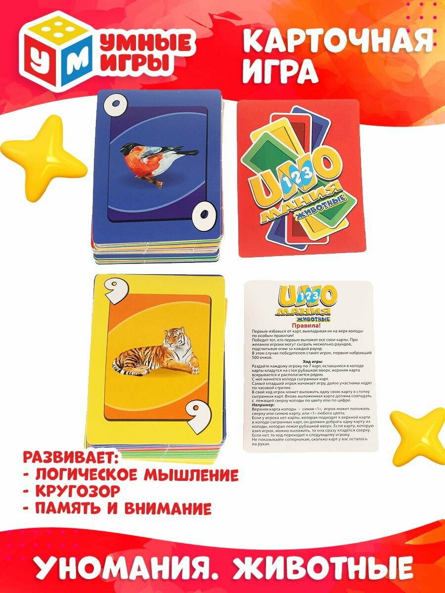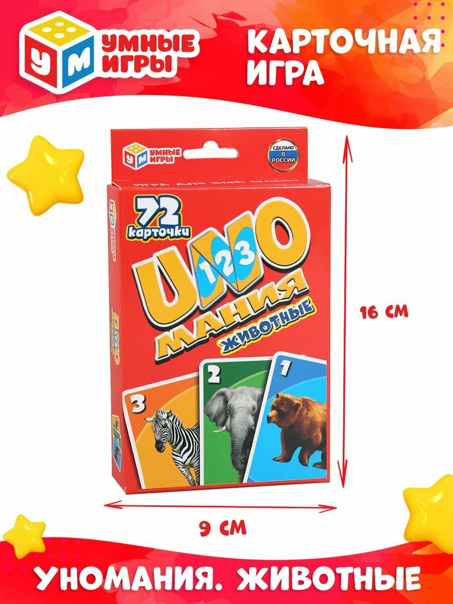 Дети не только весело проведут время, но и познакомятся с многообразным миром животных! Эта динамичная игра не даст скучать ни дома, ни в путешествии. Она прекрасно подойдёт для досуга и в кругу семьи, и в компании друзей. Цель игры - первым избавиться от своих карт, выкладывая из на верх клоды по простым правилам. Карточная игра УНОмания. Животные ТМ Умные игры - отличный повод собраться с друзьями или в кругу семьи и увлекательно провести время.