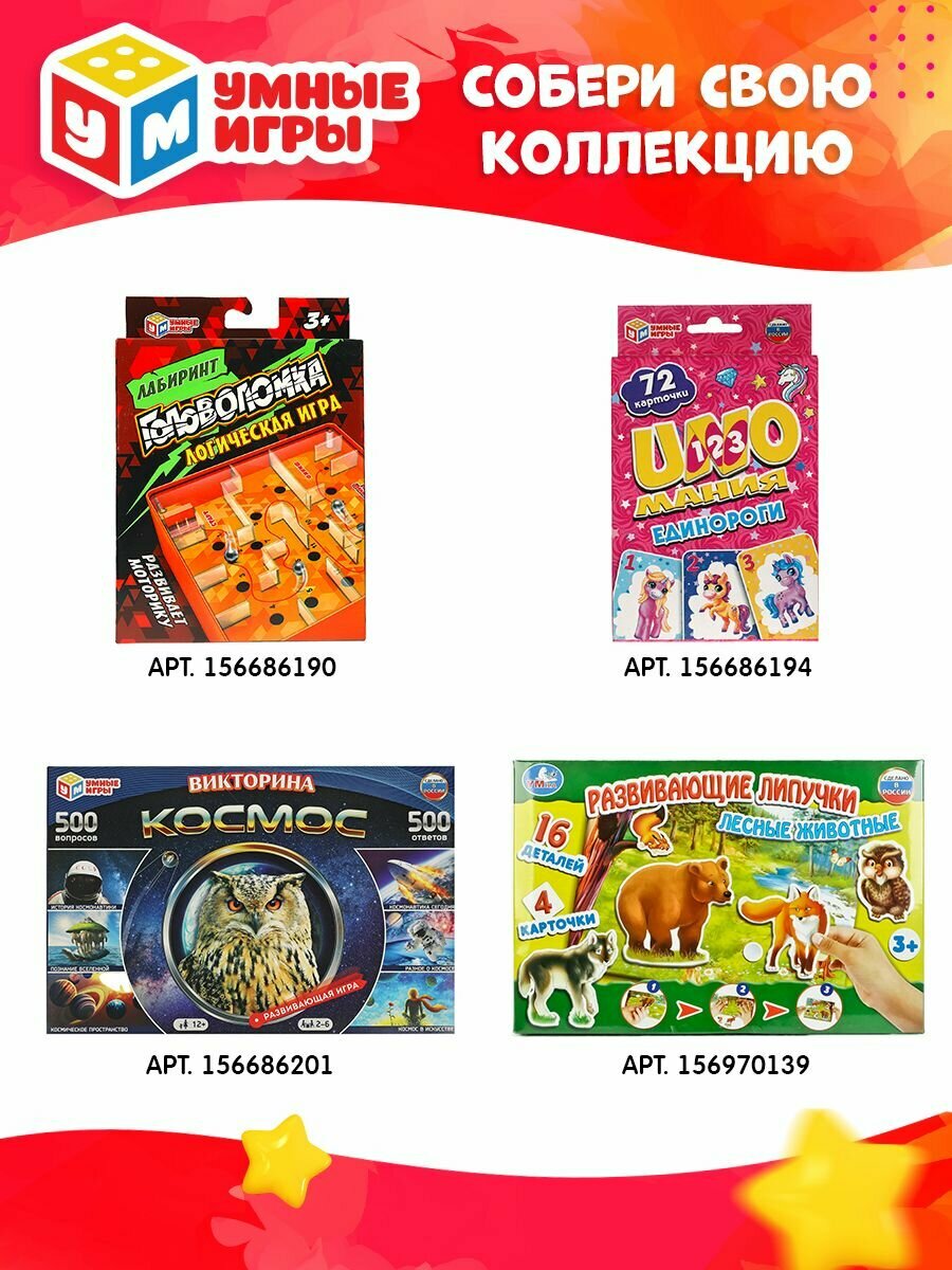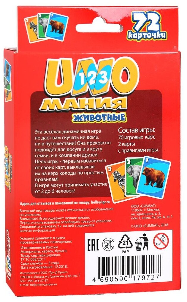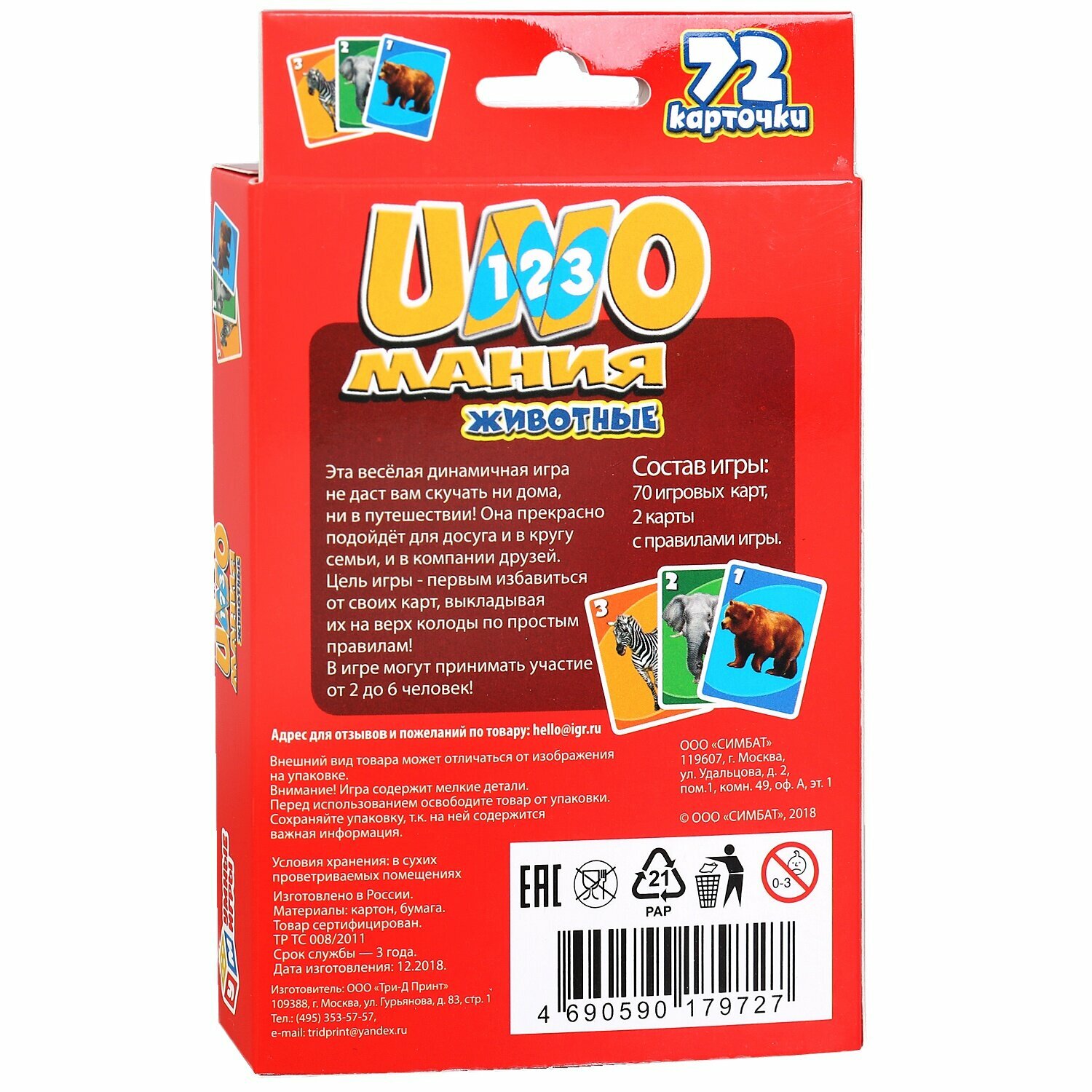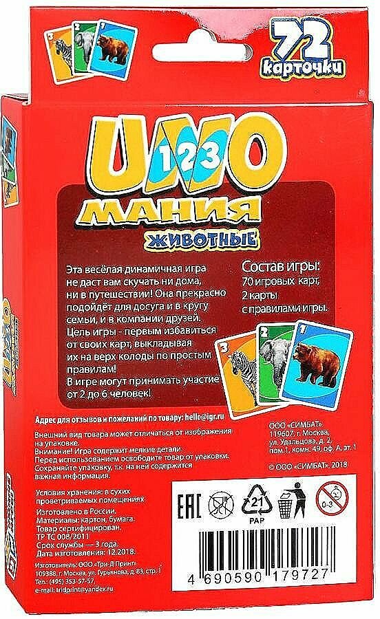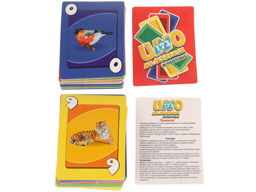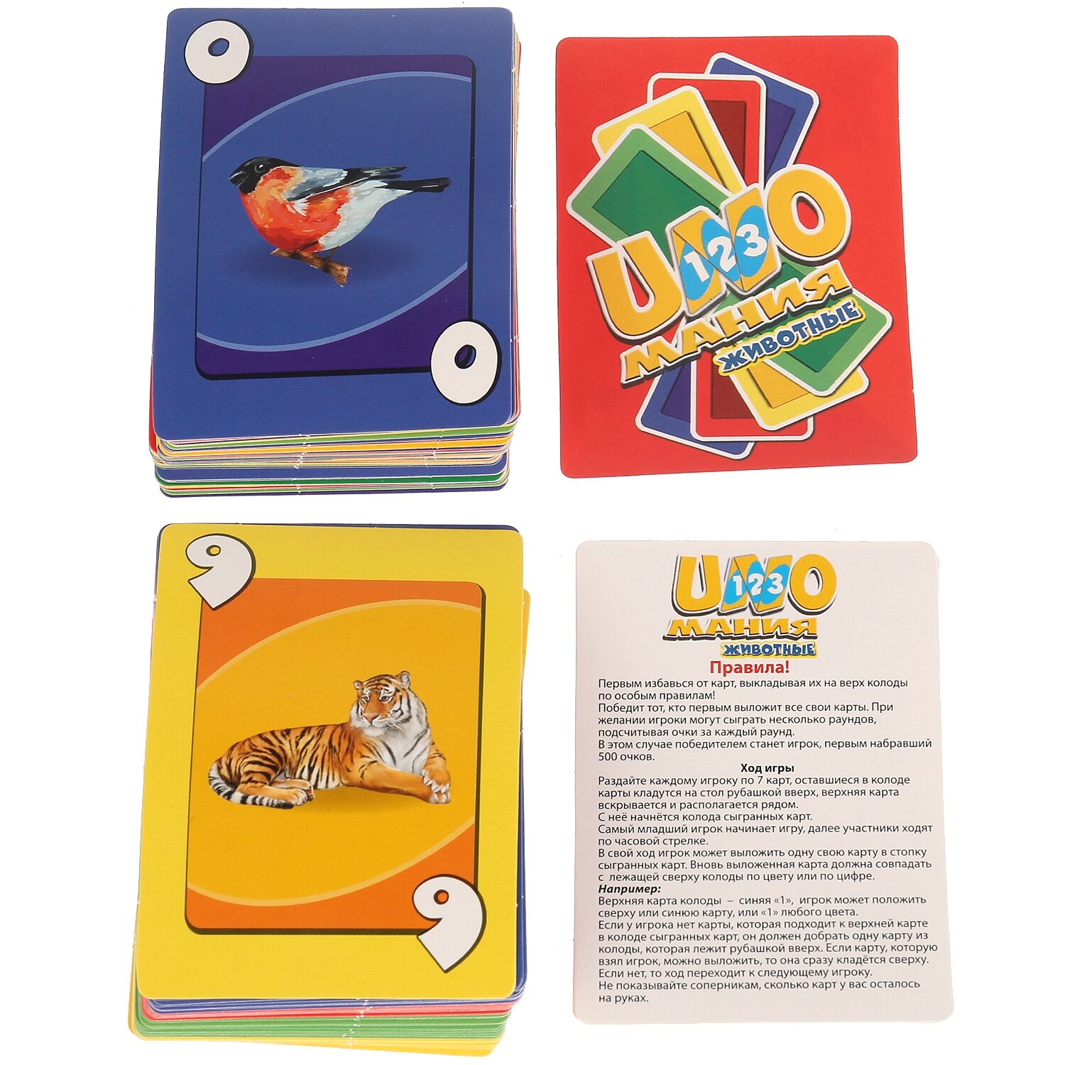 Дети не только весело проведут время, но и познакомятся с многообразным миром животных! Эта динамичная игра не даст скучать ни дома, ни в путешествии. Она прекрасно подойдёт для досуга и в кругу семьи, и в компании друзей. Цель игры - первым избавиться от своих карт, выкладывая из на верх клоды по простым правилам. Карточная игра УНОмания. Животные ТМ Умные игры - отличный повод собраться с друзьями или в кругу семьи и увлекательно провести время.
