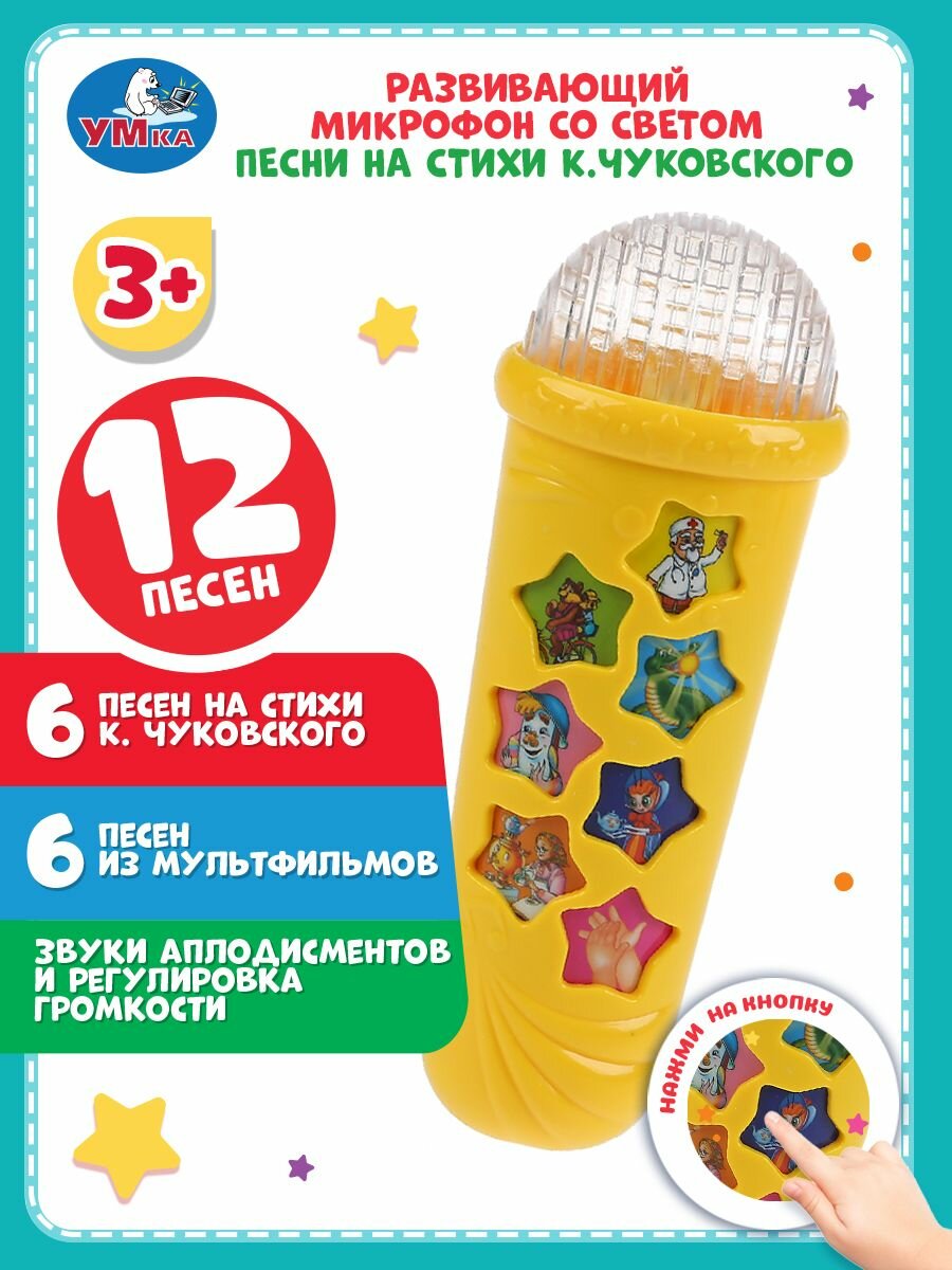 Для развития слуха ребёнку необходимы постоянные и разнообразные стимулы. Помочь в этом сможет обучающий микрофон ТМ «УМка»!- 6 песен на стихи К. Чуковского- 6 песен из мультфильмов- регулировка громкости- звуки аплодисментов- световые эффектыИграИграя с микрофоном, дети находят связь между своими действиями и звуками, исходящими от игрушки. Игры сформируют основу для последующего развития музыкального вкуса ребёнка, подготовят его к творческой деятельности и просто порадуют.Список песен на стихи К. Чуковского: «Айболит», «Тараканище», «Краденое солнце», «Мойдодыр», «Муха-Цокотуха», «Федорино горе».Список песен из мультфильмов: «Песня Мамонтёнка», «Бременские музыканты», «Облака», «Чунга-Чанга», «Весёлая карусель», «Песня Трубадура».Развивает:- мелкую моторику- координацию- слух- чувство ритмаРаботает от 2 батареек типа ААА (входят в комплект).Рекомендовано для детей от 1 года.