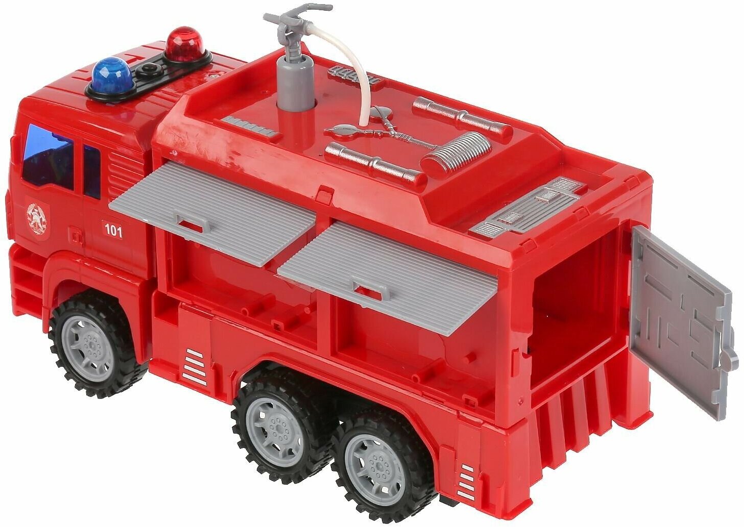 Эта пожарная машинка не только качественная и прочная, но и очень реалистичная. А достигается сходство с оригиналом за счет выдвигаемой лестницы на корпусе и брандспойта со шлангом, из которого по-настоящему льется вода и можно легко изобразить тушение пожара во время игры.Питание: 3 батарейки LR44.Особенности: - Игрушка, выполненная в виде пожарной машины, удивит мальчишек реалистичностью и проработкой деталей кузова.- Во время игр с машинкой дети смогут изобразить тушение возгорания, выдвигая лестницу и разбрызгивая воду из функционального брандспойта со шлангом.- Рельефные колеса свободно вращаются, позволяя катать машинку, а встроенный инерционный механизм поможет проехать небольшое расстояние самостоятельно после оттягивания игрушки назад.- Изделие окрашено стойкими и безопасными для детей красителями, а выполнено оно из ударопрочного, сертифицированного пластика высокого качества.- Игры с машинкой сделают досуг мальчишек интереснее, а также помогут им улучшить координацию движений, мелкую моторику и воображение.