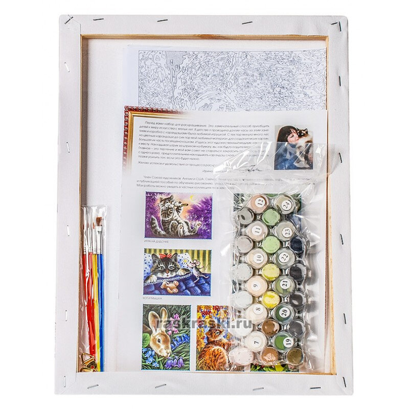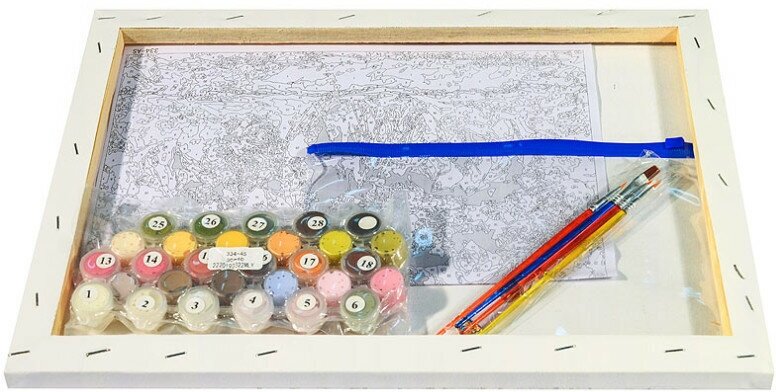 | Комплектация | Холст на подрамнике, Акриловые краски, 4 кисти, Крепеж для подвешивания картины, Контрольный лист, Пакет А-5 с замком-застежкой для хранения красок. |