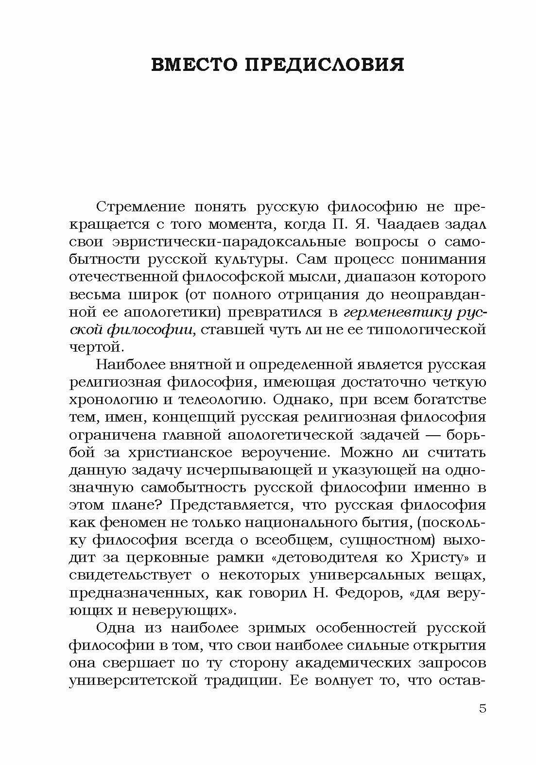 В монографии анализируются различные модусы русской философии, в результате чего обнаруживается такая ее инвариантная черта как интуиция смысла. Эта интуиция организует ценностно-смысловое пространство русской философии как нечто единое. Интуиция смысла пронизывает и эсхатологические устремления русской мысли и находит воплощение в конструировании оригинальных социальных проектов. Большой пласт исследования посвящен русской литературе, в которой обнаруживается сплав этических, социальных и метафизических построений, проникнутых общей идеей поиска смысла. Заключительный раздел посвящен знаковым персоналиям русской философии, таким как Ф. М. Достоевский, Л. Н. Толстой, Н. Ф. Федоров, А. П. Платонов, чье творчество является наглядной иллюстрацией главной особенности русской философии - поиску смысла.