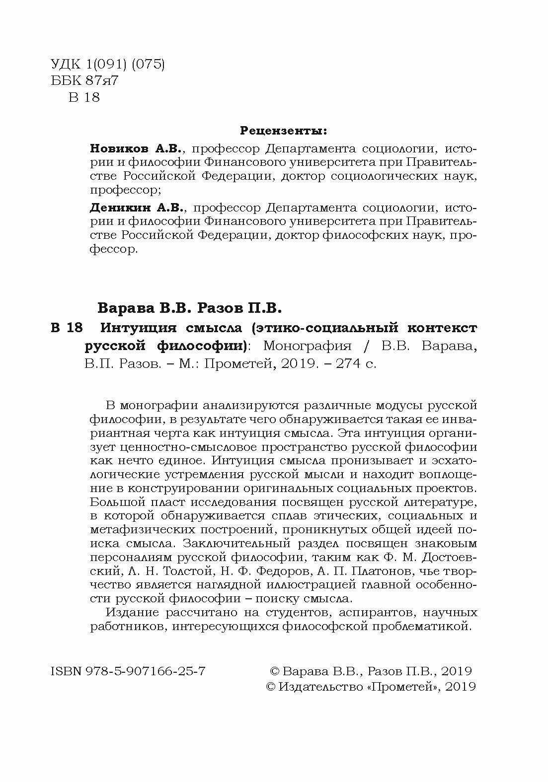 Интуиция смысла. Этико-социальный контекст русской философии. Монография (Владимир Варава); Прометей, 2019