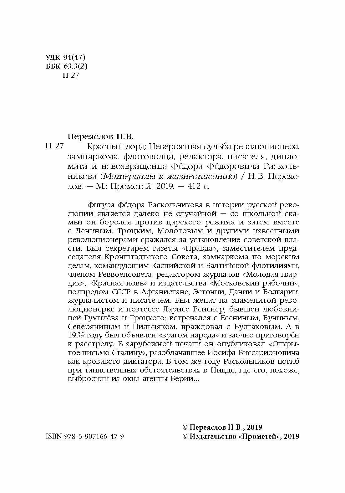 Красный лорд. Невероятная судьба революционера замнаркома флотоводца редактора Ф.Ф. Раскольникова (Н. В. Переяслов); Прометей, 2019