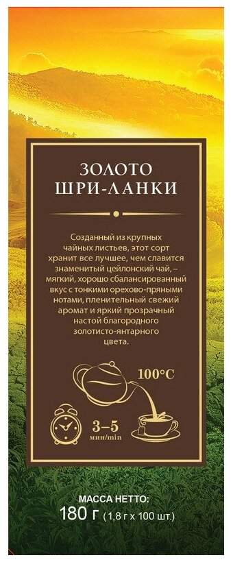 Созданный из крупных чайных листьев, этот сорт хранить все лучшее, чем славится знаменитый цейлонский чай, - мягкий, хорошо сбалансированный вкус с тонкими орехово-пряными нотами, пленительный свежий аромат и яркий прозрачный настой благодарного золотисто-янтарного цвета.