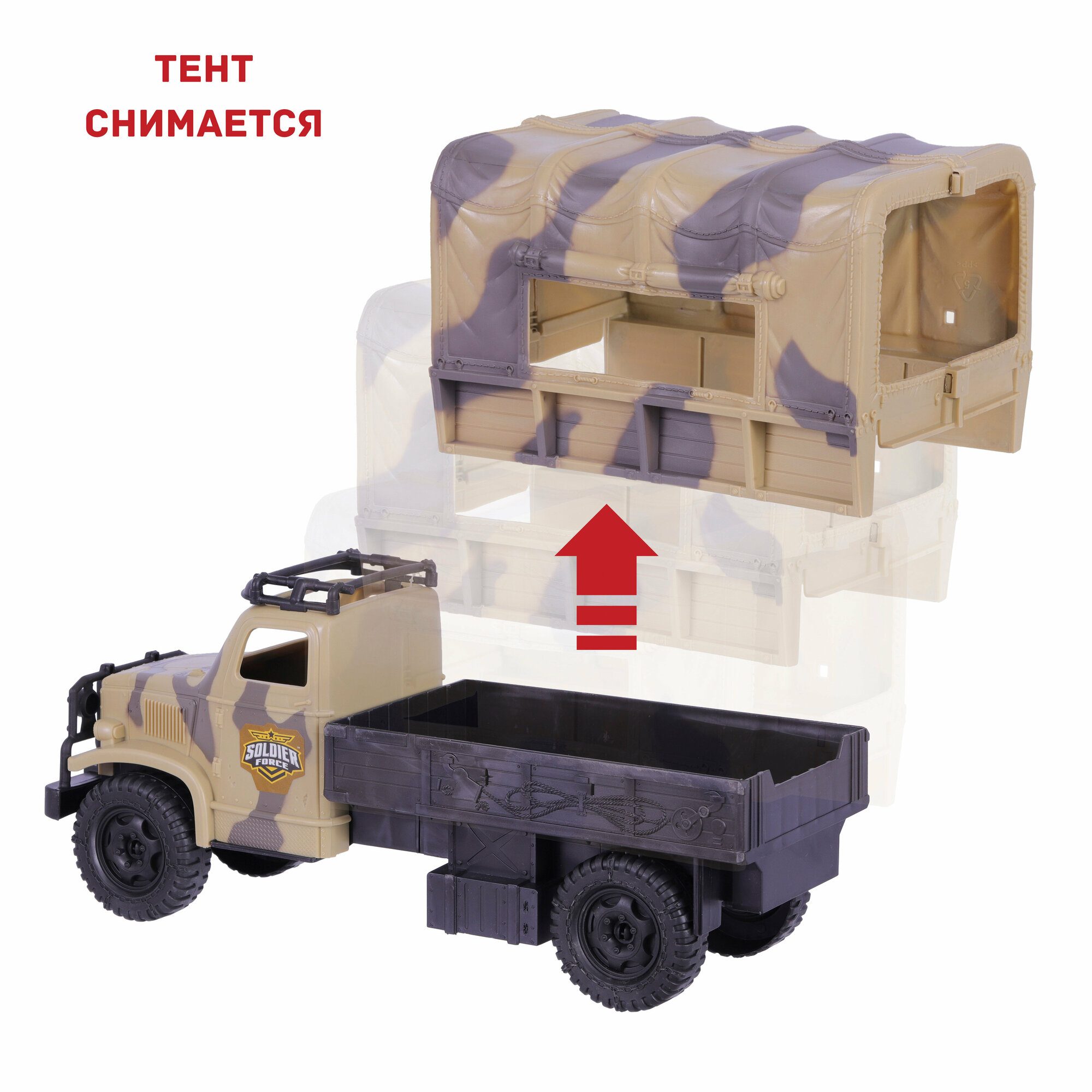 Армейский грузовик с вместительной кабиной водителя и закрытой брезентовой задней частью. Оснащен подвижными колесами, имеет боевую раскраску, чтобы быть незамеченным.