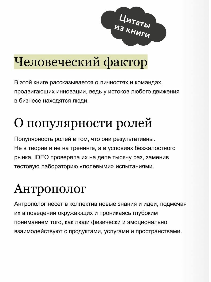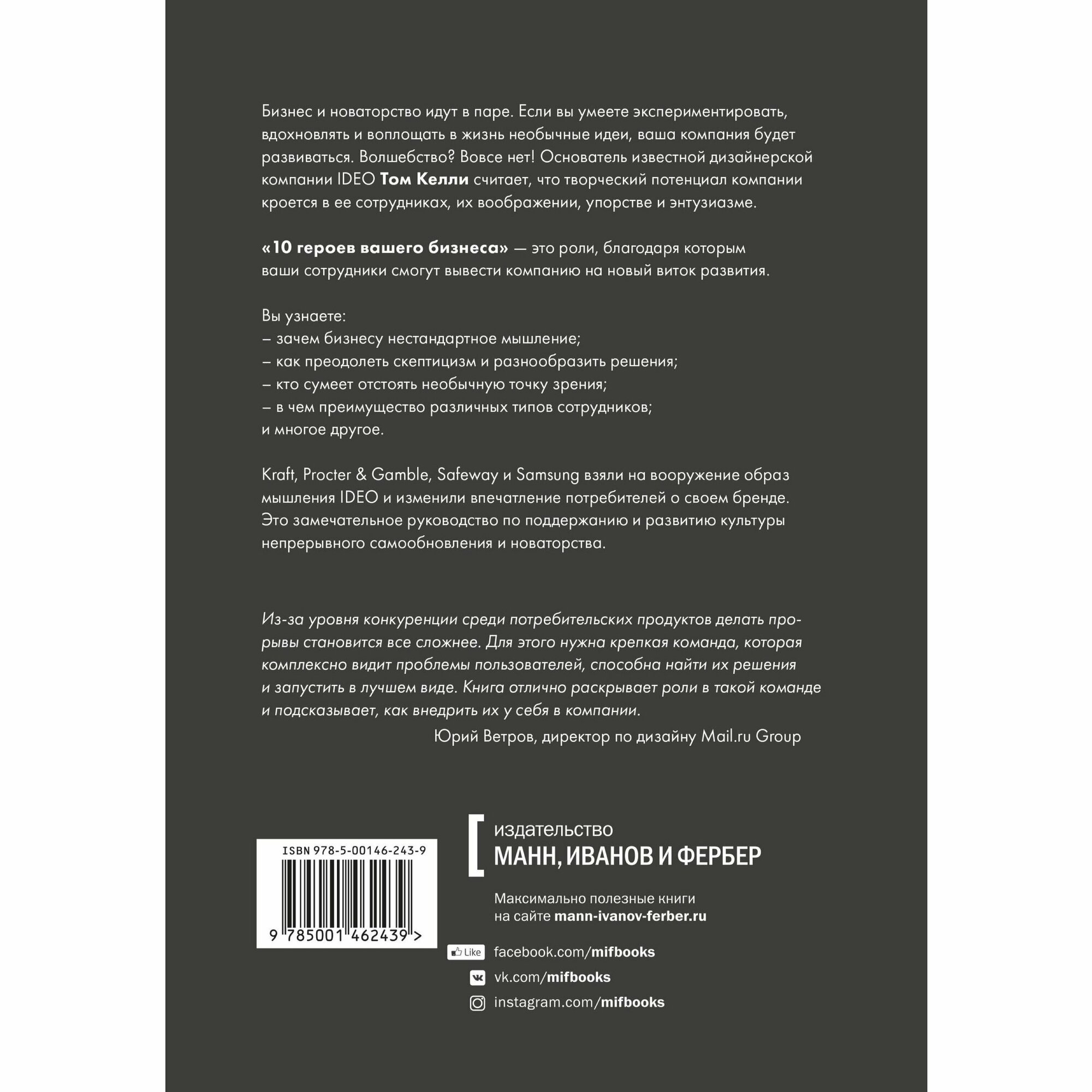 "Десять героев вашего бизнеса, которые приведут компанию к успеху" - это сборник увлекательных историй о том, как Kraft, Procter & Gamble, Safeway и Samsung взяли на вооружение образ мышления IDEO, чтобы радикально изменить впечатление потребителей о своем бренде; это потрясающее руководство по поддержанию и развитию в компании культуры непрерывного самообновления и инноваций.