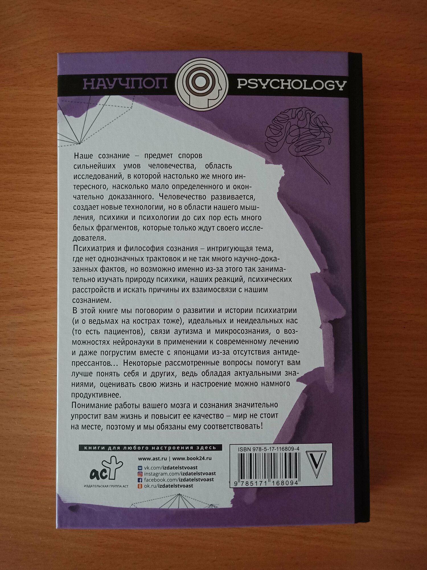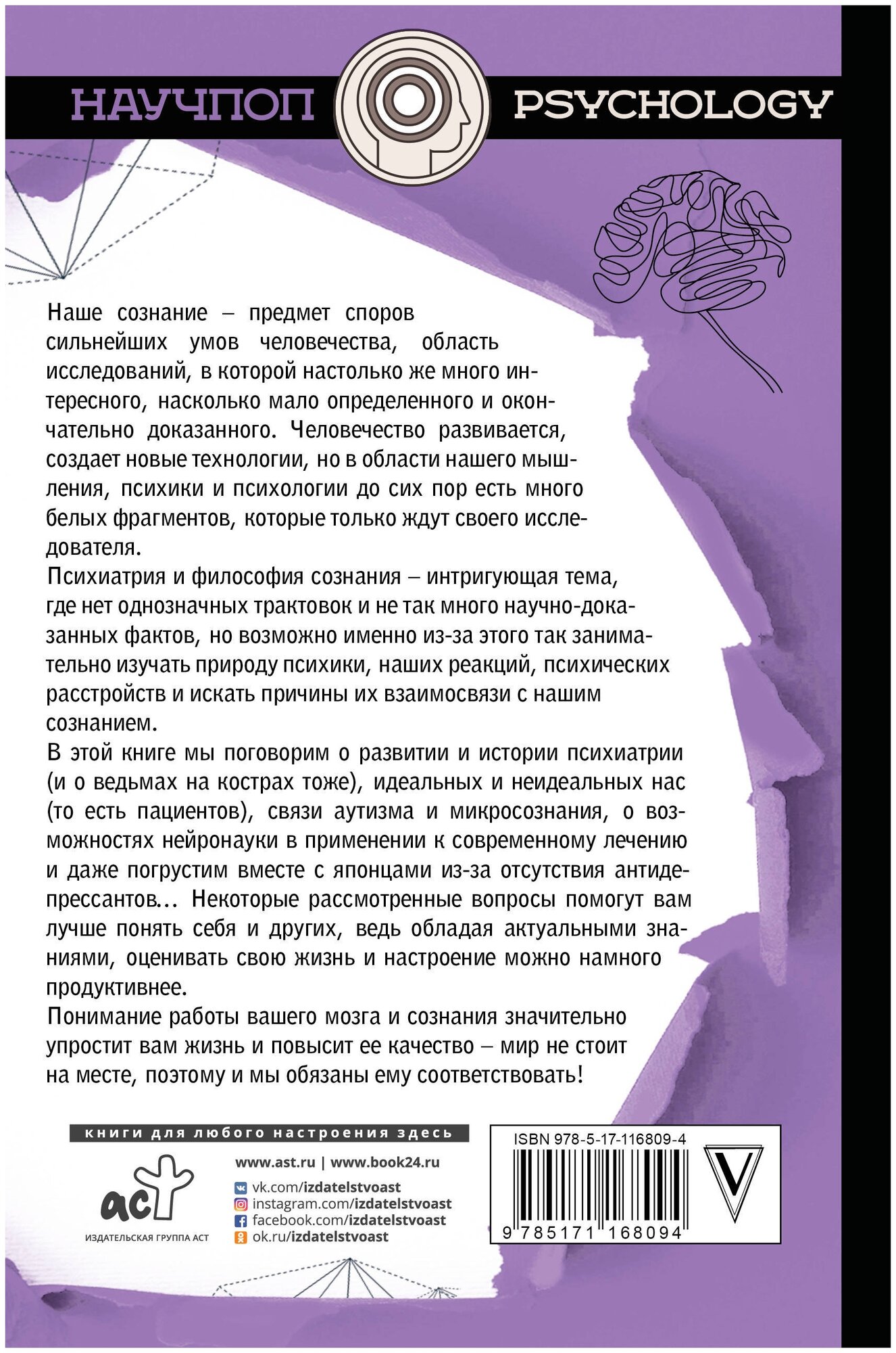 В этой книге мы поговорим о развитии и истории психиатрии (и о ведьмах на кострах тоже), идеальных и неидеальных нас (то есть пациентов), связи аутизма и микросознания, о возможностях нейронауки в применении к современному лечению и даже погрустим вместе с японцами из-за отсутствия антидепрессантов… Некоторые рассмотренные вопросы помогут вам лучше понять себя и других, ведь обладая актуальными знаниями, оценивать свою жизнь и настроение можно намного продуктивнее.