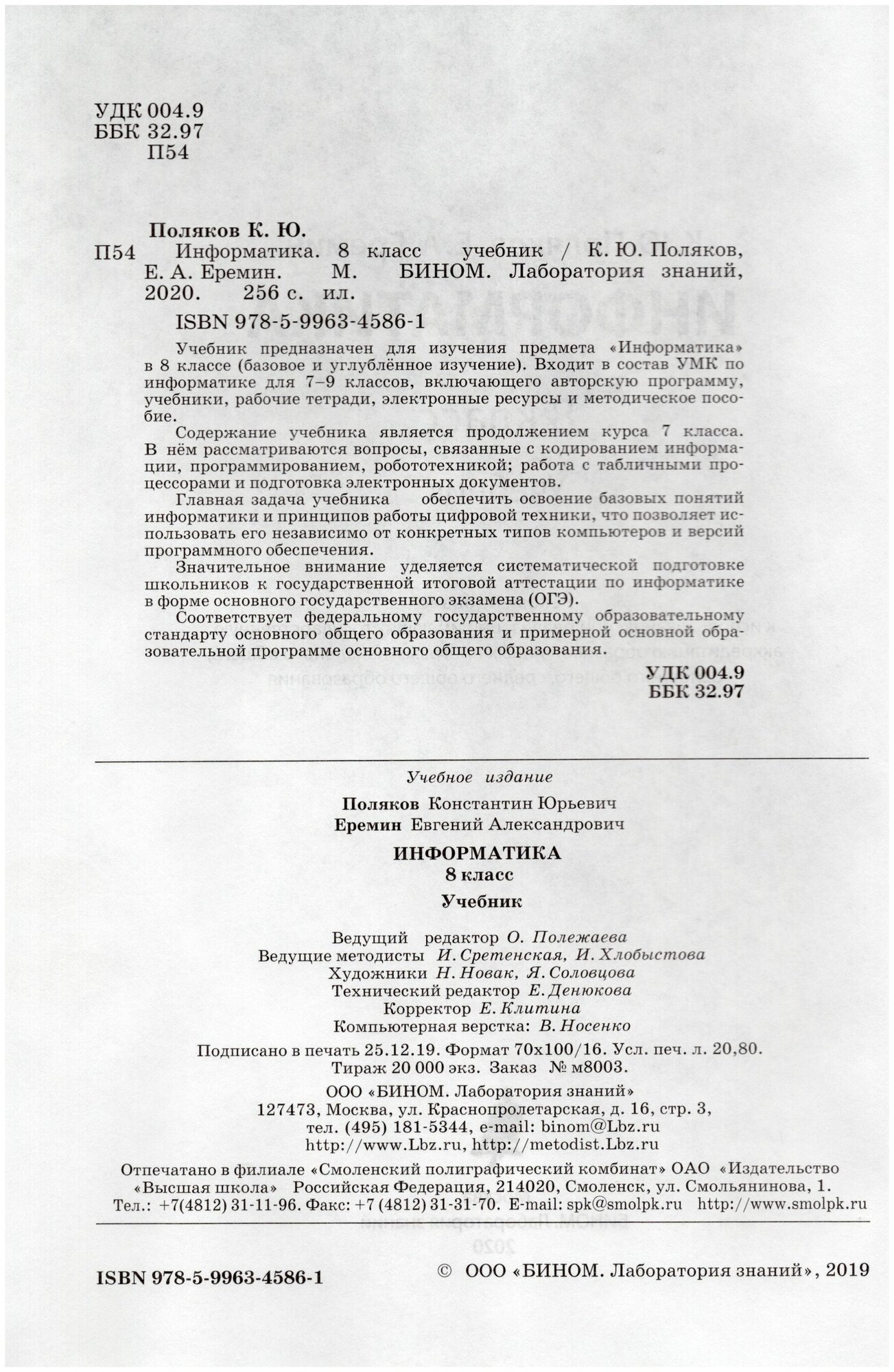 Учебное издание предназначено для изучения предмета «Информатика» в 8 классе (базовое и углублённое изучение). Входит в состав УМК по информатике для 7-9 классов, включающего авторскую программу, учебные издания, рабочие тетради, практикум, электронные ресурсы и методическое пособие. Содержание учебного издания является продолжением курса 7 класса. В нём рассматриваются вопросы, связанные с кодированием информации, программированием, робототехникой; работа с табличными процессорами и подготовка электронных документов. Главная задача учебного издания — обеспечить освоение базовых понятий информатики и принципов работы цифровой техники, что позволяет использовать его независимо от конкретных типов компьютеров и версий программного обеспечения. Значительное внимание уделяется систематической подготовке школьников к государственной итоговой аттестации по информатике в форме основного государственного экзамена (ОГЭ). Предполагается широкое использование ресурсов федеральных образовательных порталов, в том числе Единой коллекции цифровых образовательных ресурсов