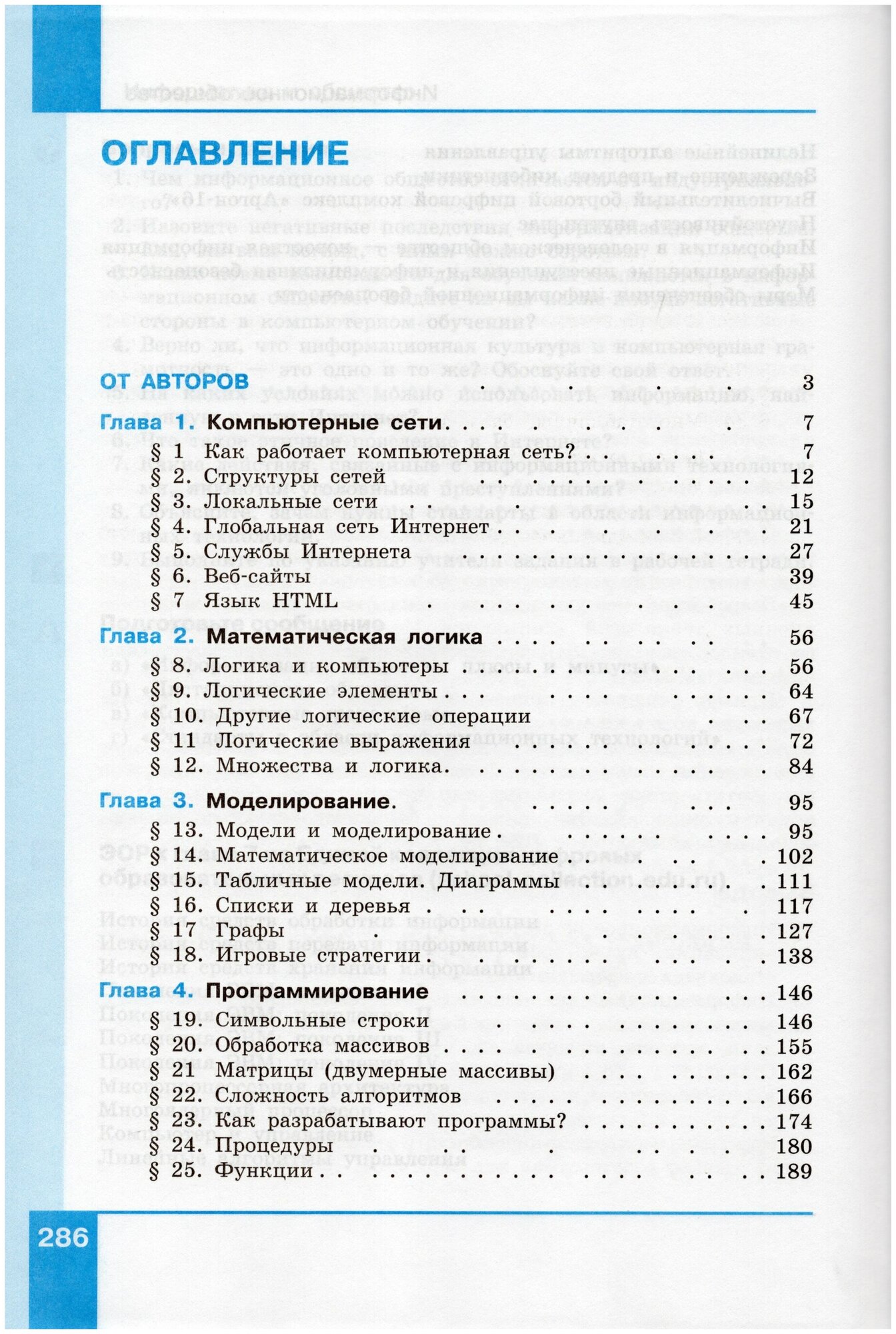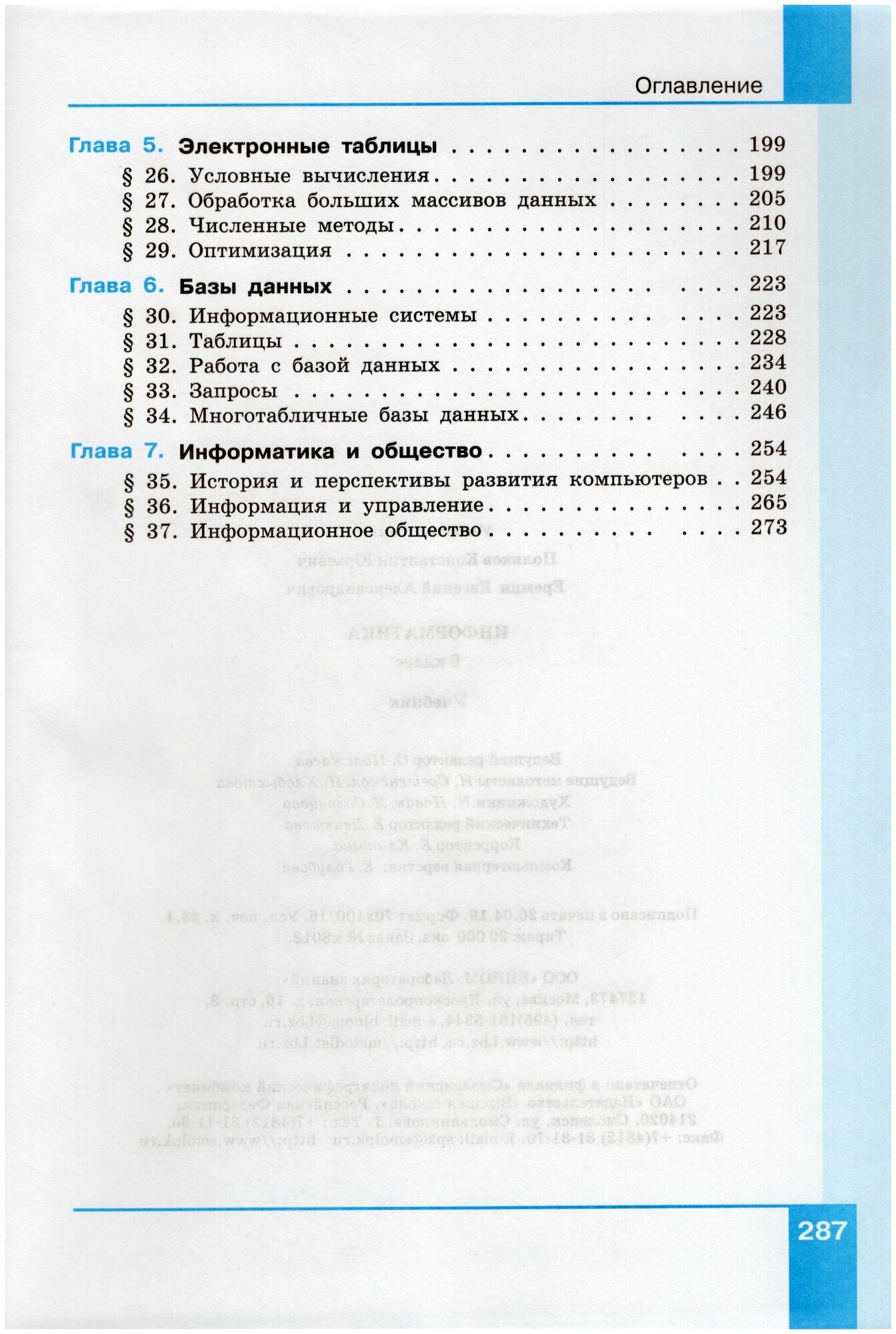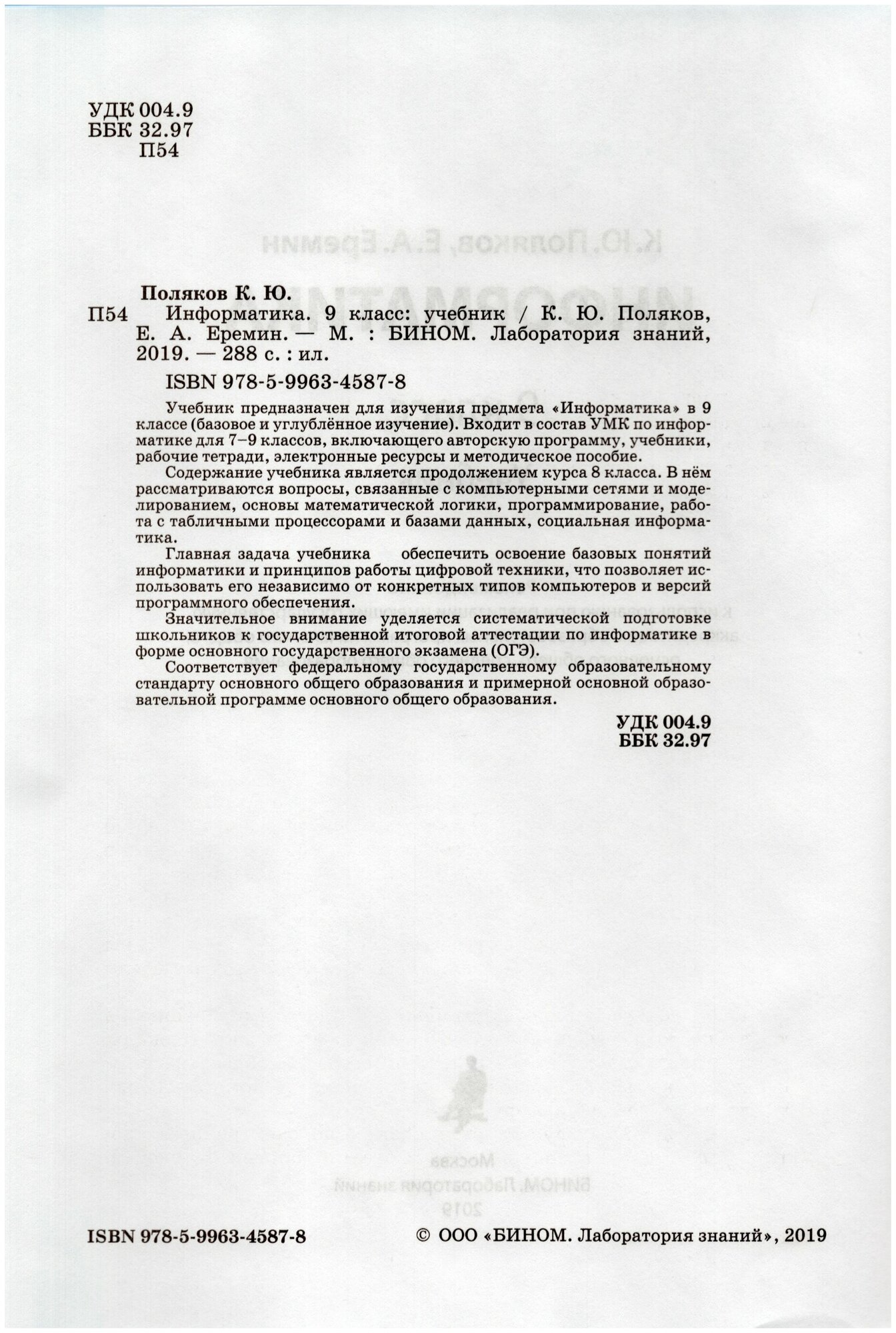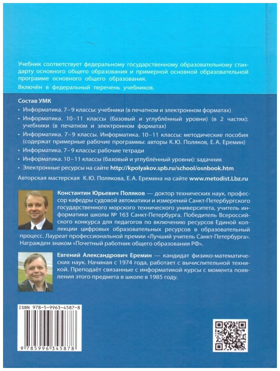 Учебное издание предназначено для изучения предмета «Информатика» в 9 классе (базовое и углублённое изучение). Входит в состав УМК по информатике для 7–9 классов, включающего авторскую программу, учебные издания, рабочие тетради, электронные ресурсы и методическое пособие. Содержание учебного издания является продолжением курса 8 класса. В нем рассматриваются вопросы, связанные с компьютерными сетями и моделированием, основы математической логики, программирование, работа с табличными процессорами и базами данных, социальная информатика. Главная задача учебного издания — обеспечить освоение базовых понятий информатики и принципов работы цифровой техники, что позволяет использовать его независимо от конкретных типов компьютеров и версий программного обеспечения. Значительное внимание уделяется систематической подготовке школьников к государственной итоговой аттестации по информатике в форме основного государственного экзамена (ОГЭ). Соответствует федеральному государственному образовательному стандарту основного общего образования и примерной основной образовательной программе основного общего образования.