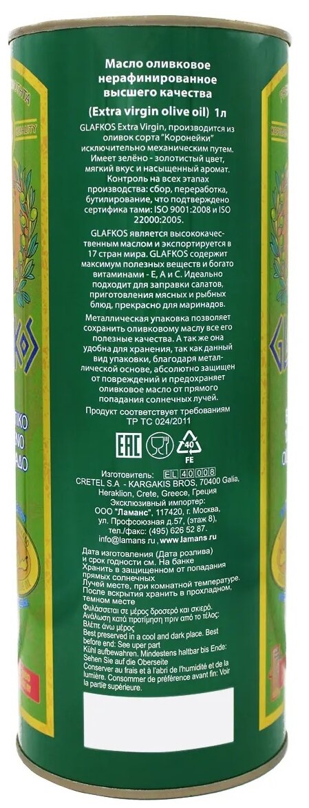 Оливковое масло «GLAFKOS» превосходный натуральный диетический продукт. Это масло получено путём первого холодного механического отжима, благодаря чему масло сохранило все полезные витамины и минеральные вещества, содержащиеся в оливках, оно произведено исключительно из оливок отборного качества сорта Коронеики, плоды внимательно и бережно собраны на южном побережье о. Крит в районе Мессара (Греция), который является одним из наиболее благоприятных мест на планете для выращивания оливок. Масло «GLAFKOS»EV – имеет насыщенный мягкий вкус олив, слегка горьковатое послевкусие, приятный пряный аромат и яркий золотисто-зеленый цвет, относится к классу Extra Virgin и является абсолютно натуральным продуктом. Не содержит никаких примесей и добавок.