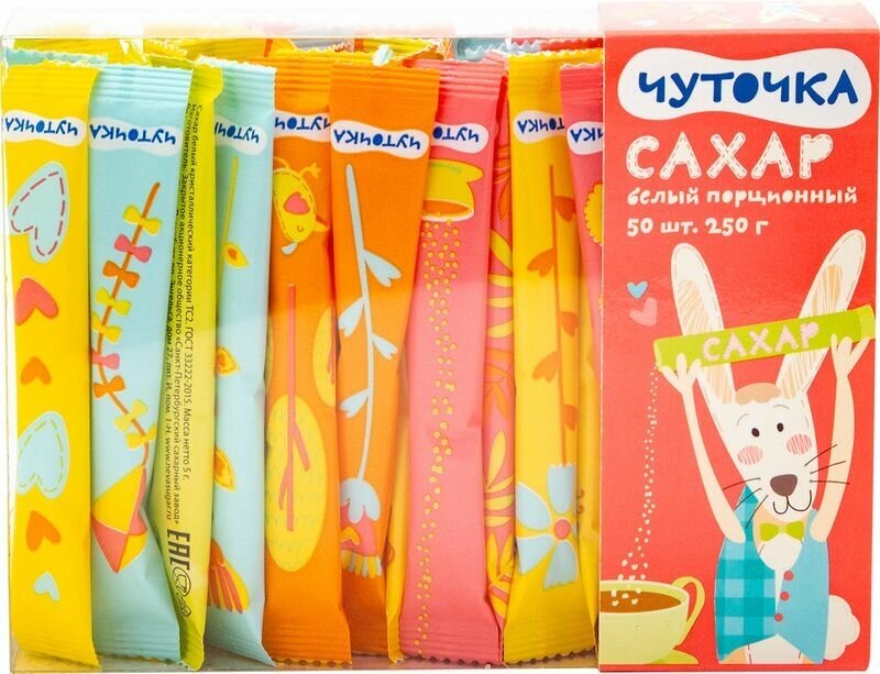 Сахар в стиках Чуточка белый. Коллекционирование сахарных стиков широко распространено в странах Европы и США, а в последнее время становится все более популярным и в России. В дизайне каждого стика использованы эксклюзивные художественные миниатюрные рисунки, объединенные единой концепцией. Состав: сахар. Пищевая ценность на 100 г продукта: углеводы - 100 г. Энергетическая ценность на 100 г продукта: 400 ккал. Условия хранения: при температуре до 40 °С и относительной влажности воздуха не выше 75%. Вес: 250 г. 50 стиков в упаковке по 5 г. Тип упаковки: картонная. Производитель: Санкт-Петербургский сахарный завод.