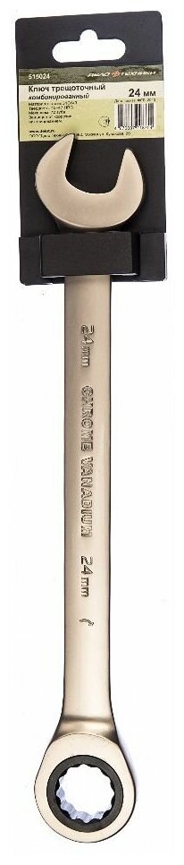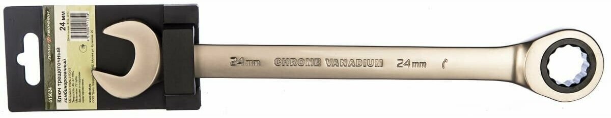Комбинированный трещоточный ключ 24 мм ДТ 50/5 Дело Техники предназначен для монтажа и демонтажа крепежных соединений. Простой в применении ручной инструмент, который изготовлен из хромванадиевой стали, стойкой к интенсивным нагрузкам. Состоит из рожковой головки и трещотки с 72-зубцовым механизмом.Преимущества Конструкция комбинированного трещоточного ключа 24 мм ДТ 50/5 Дело Техники из хромванадиевой стали, которая обладает повышенной твердостью; Поставляется на пластиковом холдере; Длина инструмента 335 мм.