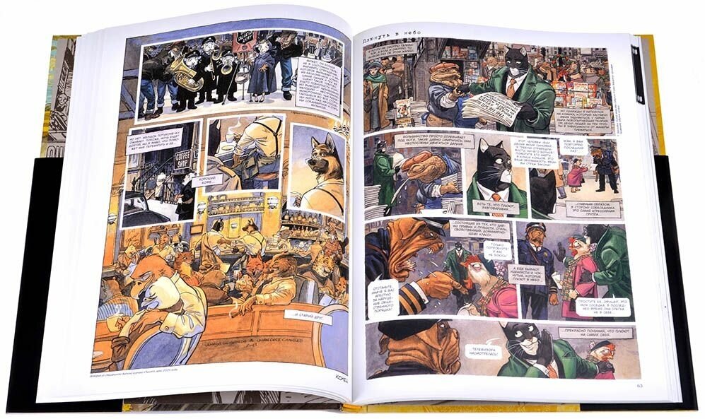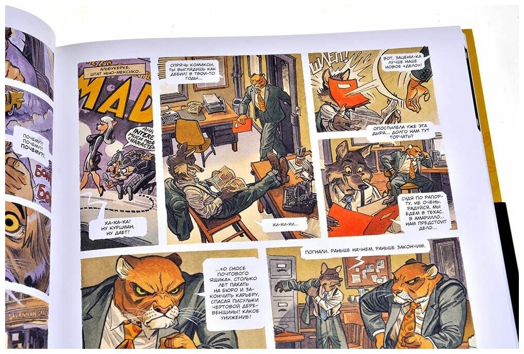 После мучительных ожиданий поклонников первоклассных европейских комиксов Азбука наконец издала третий том Блэкседа. В него входит последняя на данный момент история "Амарилло" и богатая галерея рисунков, обложек и скетчей от невероятного художника серии Хуанхо Гуарнидо. Написан и нарисован комикс испанцами, а это значит, что они отображали культуру, историю и атмосферу Америки середины прошлого века со своим самобытным взглядом и идеалистическими представлениями о духе того времени. В итоге получилась настоящая выжимка из жанров роуд-муви, приключений, лихого детектива и криминального триллера. А вот нуара здесь практически нет, он остался в первом томе. Палитра здесь яркая и сочная, герои невероятно харизматичные, а окружающий мир, населенный антропоморфными животными, проработан до мельчайших деталей. Очень рад, что теперь на русском издана эта жемчужина BD и с нетерпением жду новой истории про обаятельного черного кота-детектива.