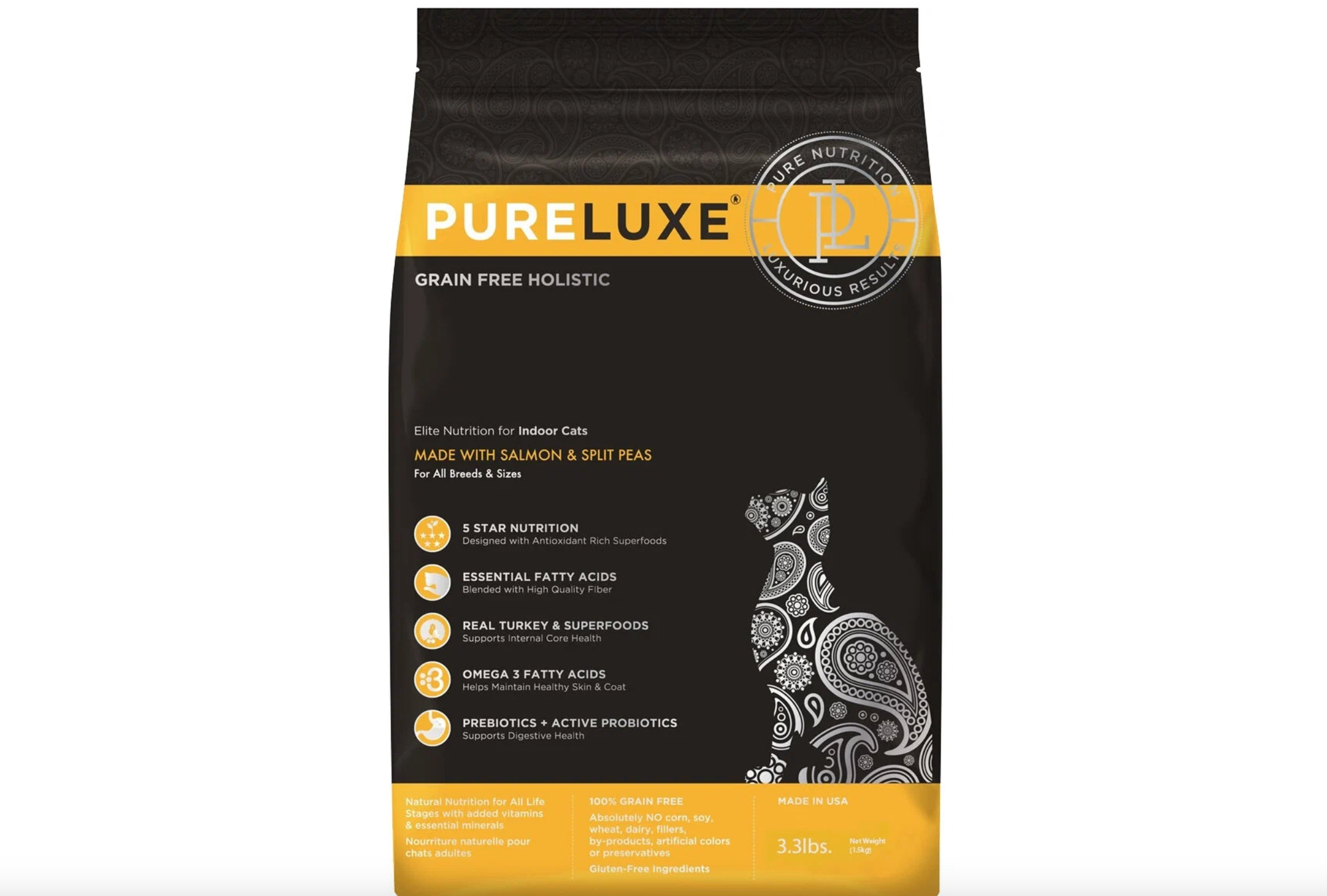Питание холистик класса, не содержит злаков. Свежее диетическое филе индейки легко усваивается и гарантирует великолепный вкус. Корм подойдт для кошек с чувствительной пищеварительной системой. Обогащнный пищевыми волокнами состав помогает вывести проглоченную шерсть, а также способствует поддержанию нормального веса. В рационе отсутствуют: мясо курицы, говядина, молочные продукты, свкла, кукуруза, соя, искусственные антиоксиданты, консерванты, красители и усилители вкуса. Благодаря уникальной комбинации активных пробиотиков и энзимов увеличивается усвояемость питательных веществ и нормализуется работа пищеварительной системы. Входящая в состав юкка Шидигера способствует уменьшению запаха фекалий. Особое внимание уделено здоровью мочевыделительной системы: оптимальное содержание минералов и добавка клюквы (которая подкисляет мочу и обладает бактерицидными и противовоспалительными свойствами) эффективно профилактируют мочекаменную болезнь. В состав корма входят глюкозамин и хондроитин для защиты суставов. Оптимальный баланс натуральных антиоксидантов и омега-3 жирных кислот эффективно поддерживает работу иммунной системы и способствует борьбе с воспалениями, что имеет особое значение при проживании в неблагоприятных экологических условиях. Корм Pureluxe - лучший выбор для городского питомца!Состав:Филе индейки (19%), молотая индейка (19%), сушеный горошек, сушеная чечевица, сушеный нут, молотый лосось (6%), куриный жир (сохраненный смешанными токоферолами), филе лосося, томатный жмых, льняное семя, натуральный ароматизатор, сушеная клюква, кокосовое масло, сушеные корень цикория, сушеная бурая водоросль, соль, хлорид холина, витамины (добавка с витамином Е, добавка с ниацином, пантотенат кальция, ацетат витамина А, мононитрат тиамина, гидрохлорид пиридоксина, добавка с рибофлавином, добавка с витамином D3, биотин, добавка с витамином B12, фолиевая кислота ), сушеные яблоки, сушеная морковь, семена тыквы, экстракт юкки Шидигера, хлорид кальция, минералы (сульфат железа, оксид цинка, карбонат кальция, оксид марганца, сульфат меди, хелат железа, хелат марганца, хелат меди, селенит натрия, карбонат кобальта, дигидройодид этилендиамина), *таурин, смешанные токоферолы, L-карнитин, куркума, сушеный продукт ферментации Enterococcus faecium, сушеный продукт ферментации Lactobacillus acidophilus и сушеный продукт ферментации Lactobacillus casei, экстракт розмарина.