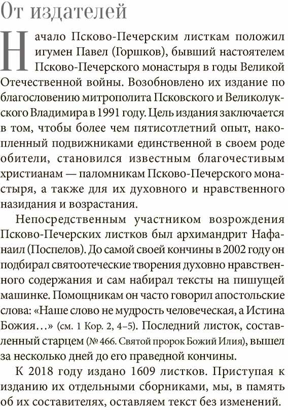 Псково-Печерские листки — уникальное собрание духовного опыта, накопленного насельниками Свято-Успенского Псково-Печерского монастыря более чем за 500 лет. Издаваемые еще со времен Великой Отечественной войны, эти листки и по сегодняшний день призваны помогать всем ищущим духовного возрастания и утешения. Теперь прикоснуться к многовековому опыту духоносных отцов смогут все — Псково-Печерские листки, старательно отобранные и оформленные, издаются отдельными, тематическими сборниками.