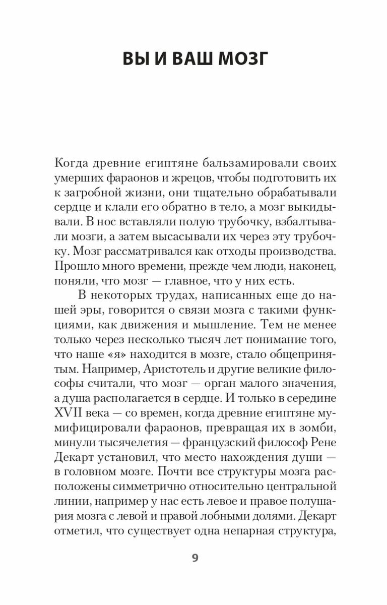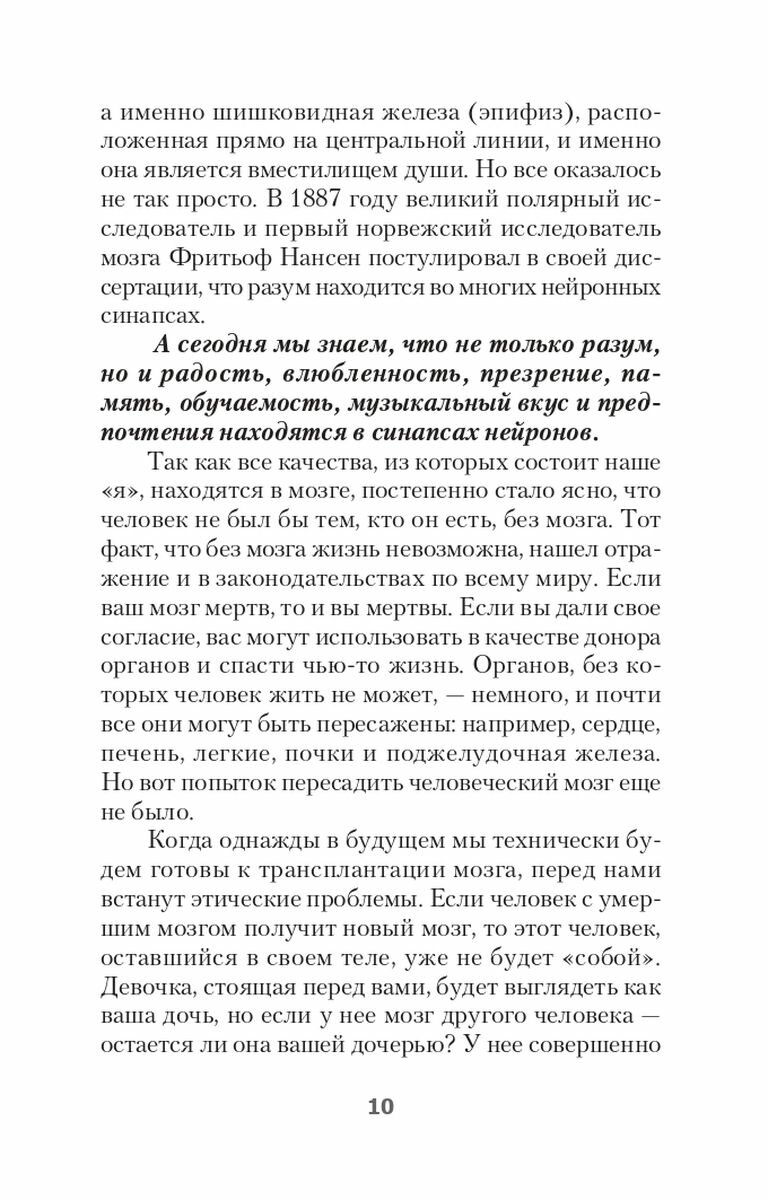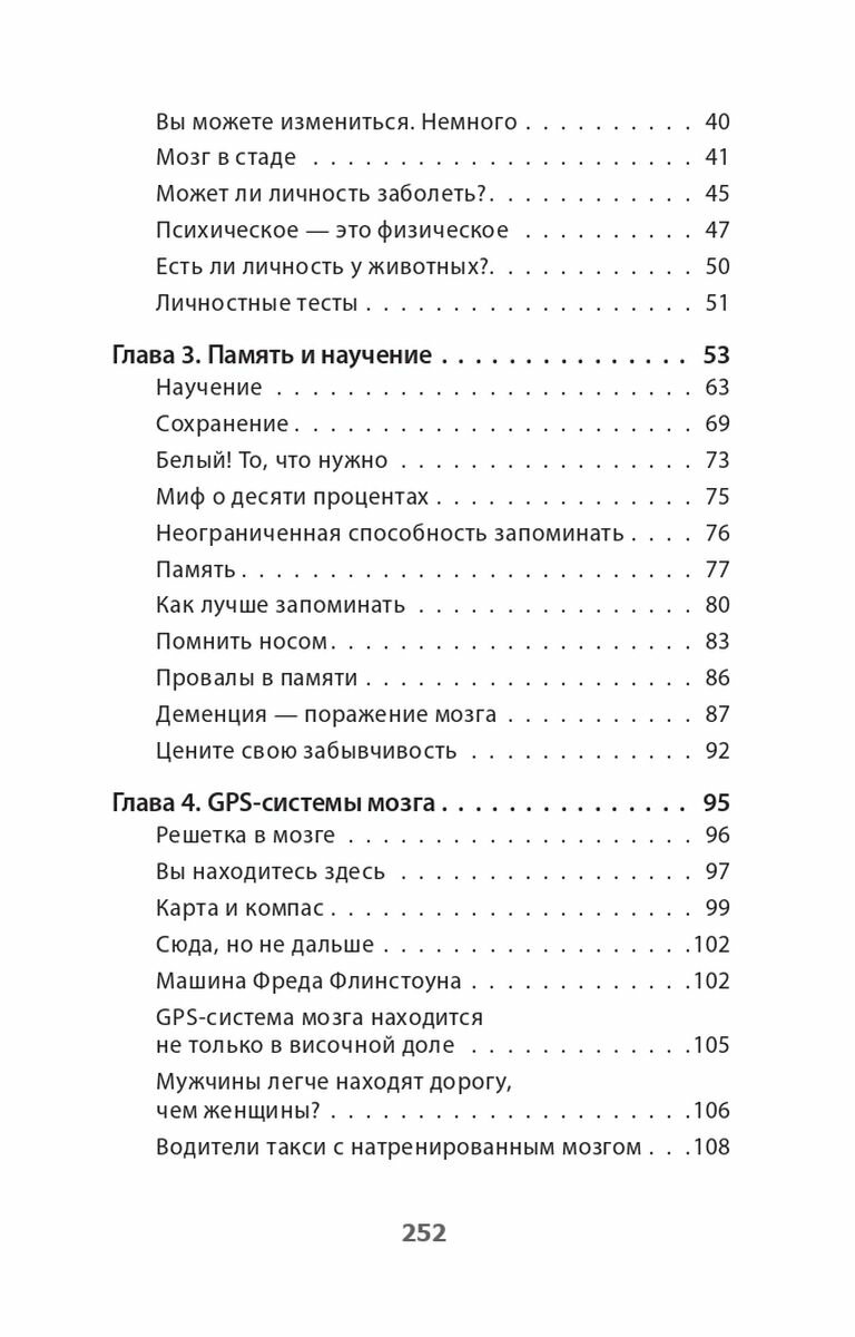 Что делает нас нами? Где начинается мысль? Разум и память, влюбленность и ненависть, логика и обучаемость, - элементы, из которых состоит наше "я", находятся в самом незаменимом органе нашего тела - мозге. Приготовьтесь отправиться в увлекательнейшее путешествие по мозгу и узнать, где находится личность, почему важно уметь забывать, в каком отделе мозга спрятан компас, откуда берутся ложные воспоминания, где хранятся эмоции и можно ли повлиять на свое настроение, и даже о том, почему мы едим мозгом. "Эта книга написана так, словно я беседую о мозге со своими близкими друзьями, и очень надеюсь, что вы, как и я, будете очарованы его многочисленными тайнами".