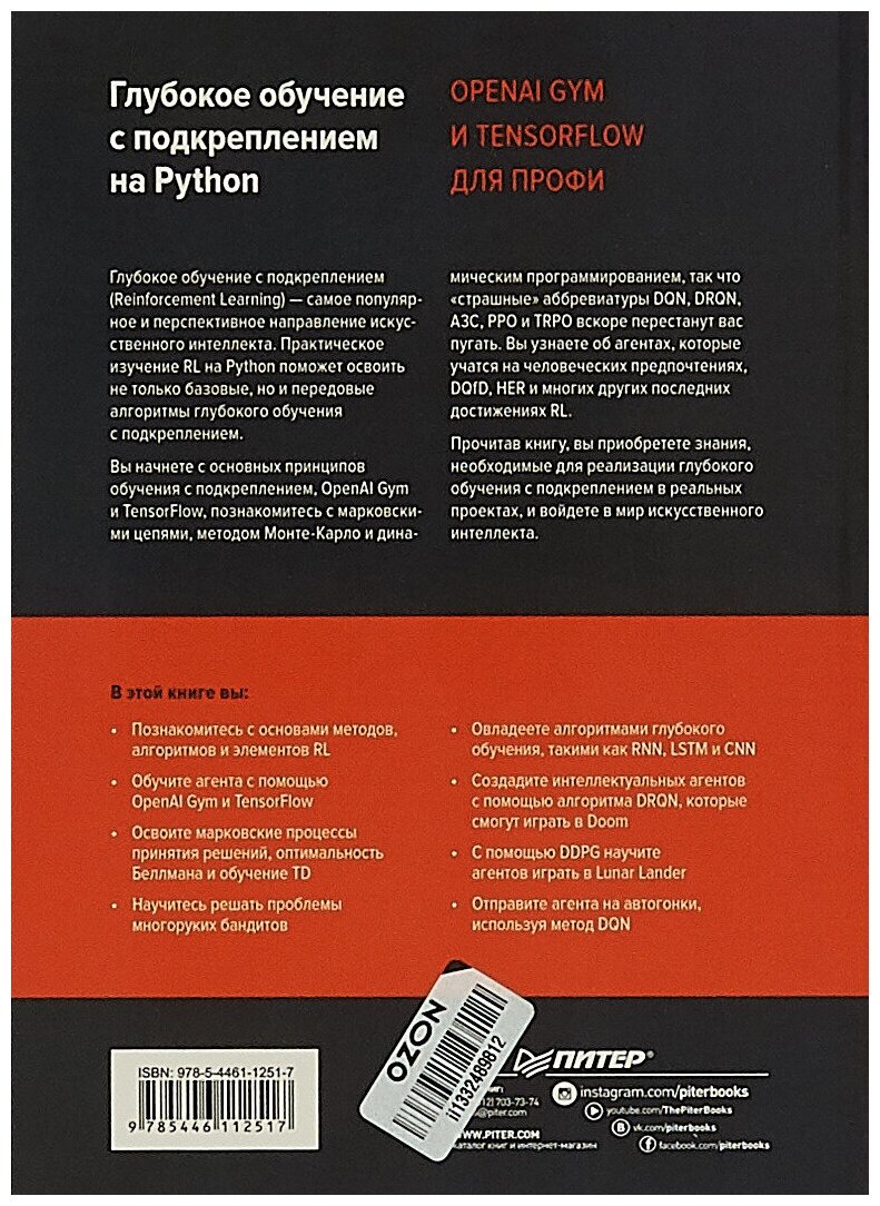 В книге автор подробно объясняет основы глубокого обучения с подкреплением, а также предоставляет множество примеров, написанных на Python, используя библиотеки OpenAI Gym и TensorFlow. Это позволяет читателю не только понять теоретические концепции, но и применить их на практике.
