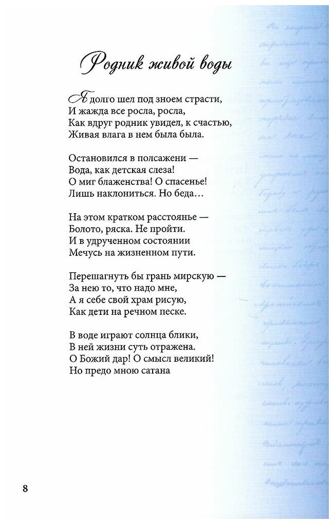Книга издана прекрасно. Это одна из самых красивых книг, которые я держала в руках.Стихи очень глубокого духовного содержания. Для меня эта книга является просто источником отдохновения, душевного успокоения и радости. Читаю стихи, прозу, рассматриваю иллюстрации, и благословенная Оптина встает перед моими глазами. Теперь я рекомендую эту книгу всем своим друзьям.