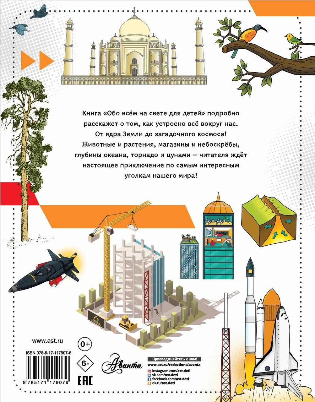 Книга "Обо всем на свете для детей" расскажет детям о том, как устроен наш мир - от ядра нашей планеты до необъятного космоса! Как устроена Международная космическая станция? Кто живет на склонах гор? Как питаются киты? Неужели и правда на крышах небоскребов устанавливают аттракционы?