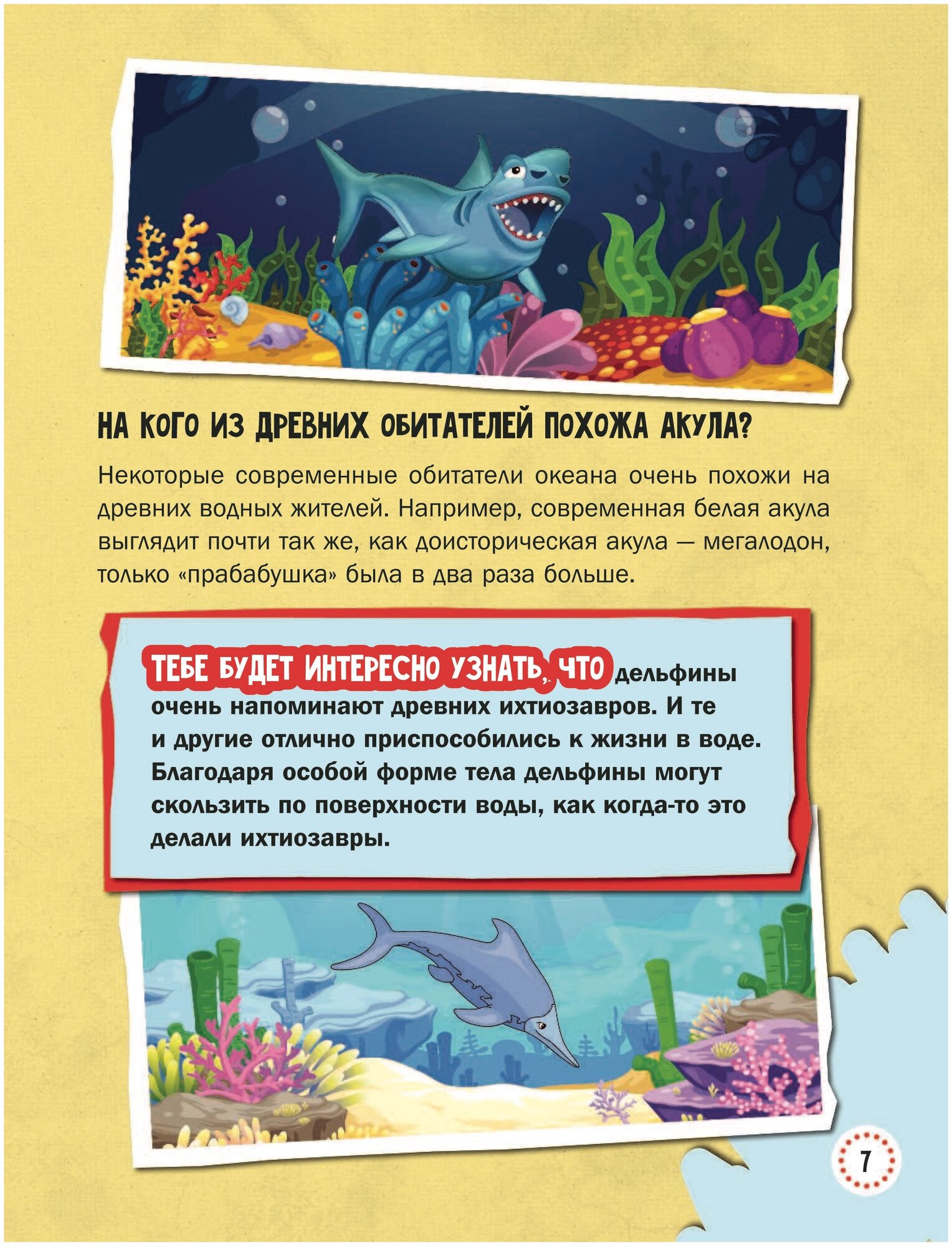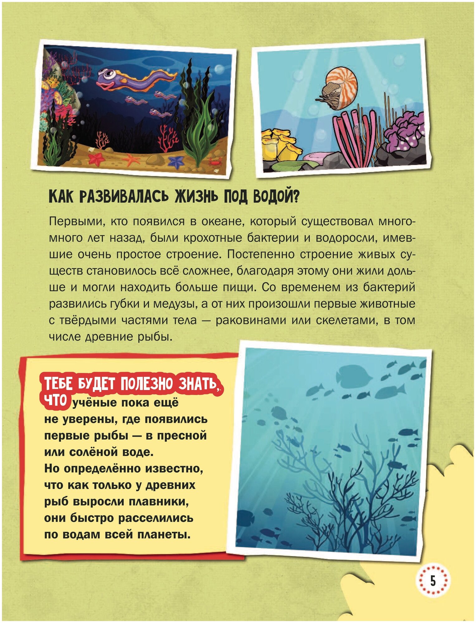 Энциклопедия про подводный мир приятно удивила количеством обитателей. На доступном для детей языке рассказывается о каждом из них - это и морской окунь, и акула, и кит, и скат. Объясняется о каждом виде рыб, об их повадках, об их поведении. Яркие и красочные иллюстрации рыб делают процесс изучения подводного мира ещё более увлекательным. Энциклопедия подойдёт для любознательных детей.