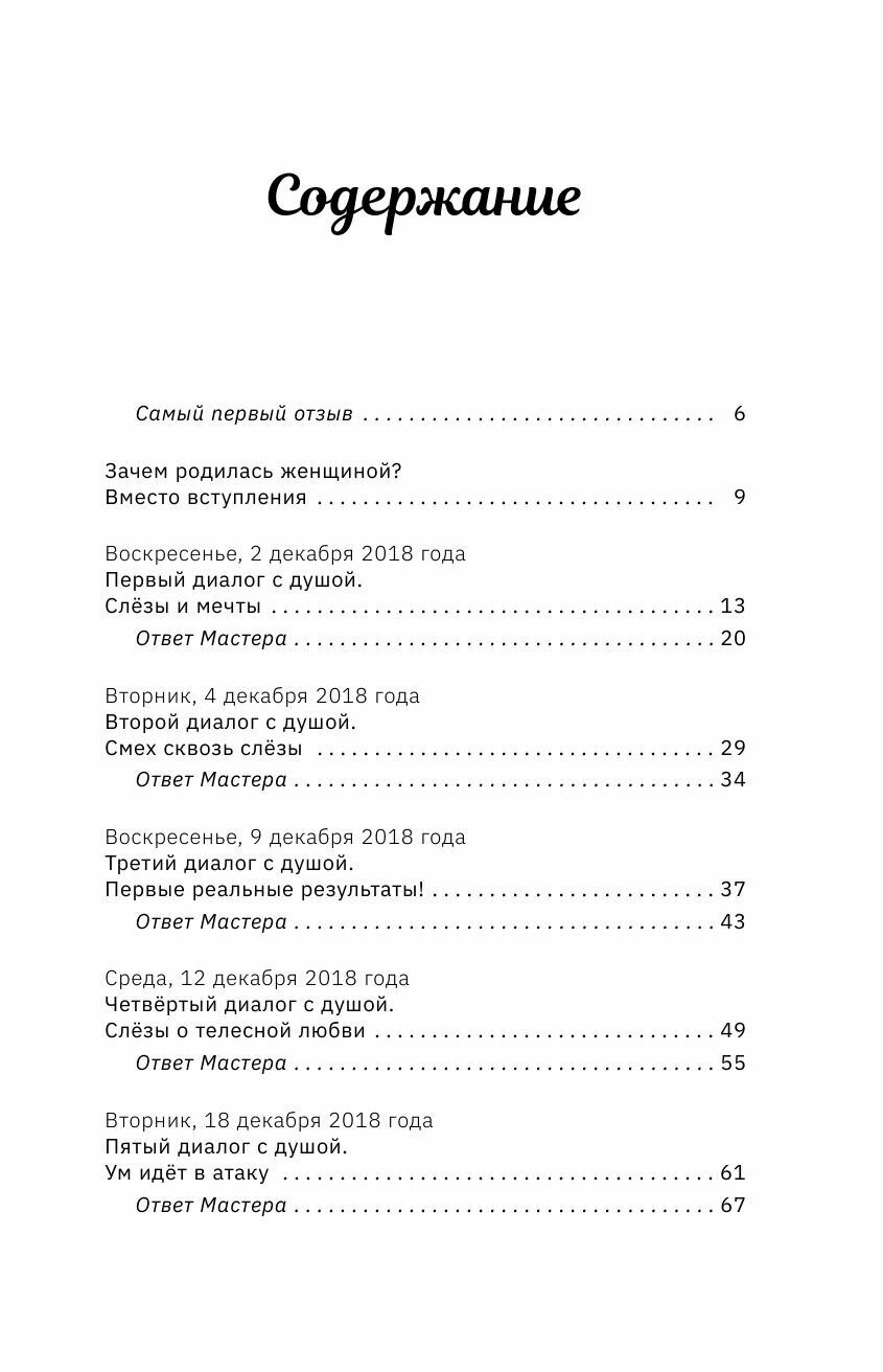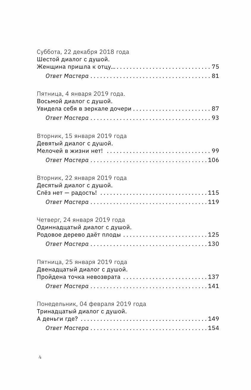 Книга-история одной женщины,которая подробно описывает свои беседы с душой,обращая внимание на определенные заблуждения и ошибки,которые ведут нас не туда.Нахожусь в процессе чтения,читать приятно,сразу проводишь параллели со своей жизнью.Автор побуждает поработать над собой,для обретения гармонии и счастья.