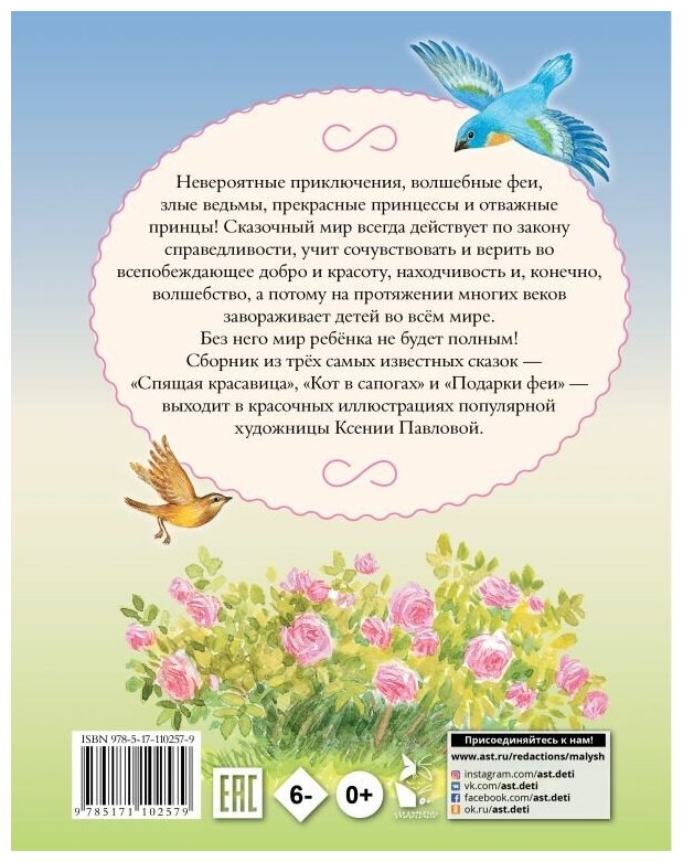Сборник из трех самых известных сказок - "Спящая красавица", "Кот в сапогах" и "Подарки феи" - выходит в красочных иллюстрациях популярной художницы Ксении Павловой.