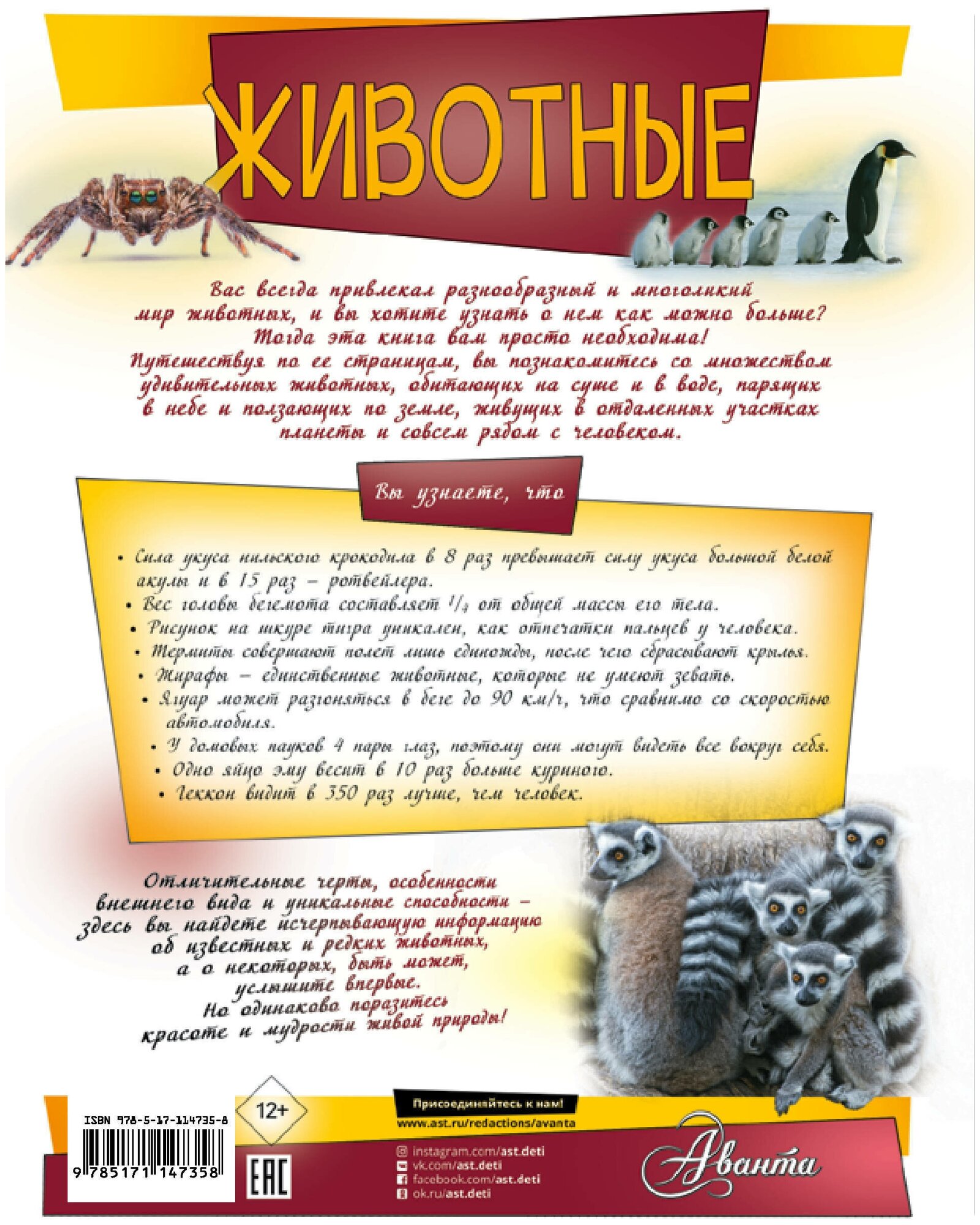 Эта большая энциклопедия откроет детям удивительный мир животных во всем его величии и многообразии. Здесь представлены млекопитающие и птицы, земноводные и пресмыкающиеся, насекомые и паукообразные. Листая страницы книги, можно изучить повадки грозных хищников, полюбоваться грациозными пернатыми, детально рассмотреть неуловимых насекомых и наконец-то увидеть вблизи животных, умело скрывающихся в природе от чужих глаз. А простая и понятная каждому классификация животного мира поможет упорядочить и систематизировать полученные знания.