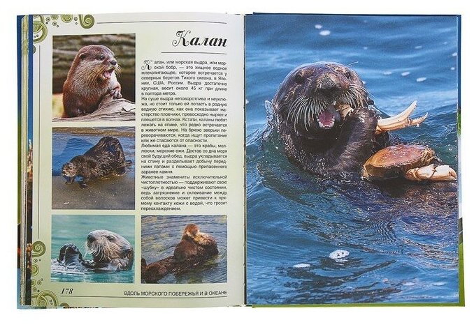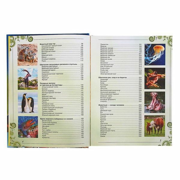 Книга потрясающая! Выбирали между несколькими подобными книгами о животных, но не во всех были все наши любимые животные, а в этой они все есть. Очень наглядные и чёткие фотографии, подробно можно разглядеть всех животных, каждое животное представлено одной большой фотографией на всю страницу и несколькими поменьше. Текст весьма содержательный, коротко и понятно для ребёнка изложена вся интересная информация. Животные в книге распределены по средам обитания, предварительно кратко описывается каждая природная зона, например: "Обитатели рек, озёр и их берегов", "Полярные жители: от Арктики до Антарктики", "Животные - соседи человека". Приятно удивлены были, что представлены в книге не только дикие животные, насекомые, морские обитатели и птицы, но и живущие рядом с человеком... и даже муха)) Ребёнок 6 лет доволен, с книгой не расстаётся, время от времени то рассматривает, то просит почитать, то сам что-то читает.