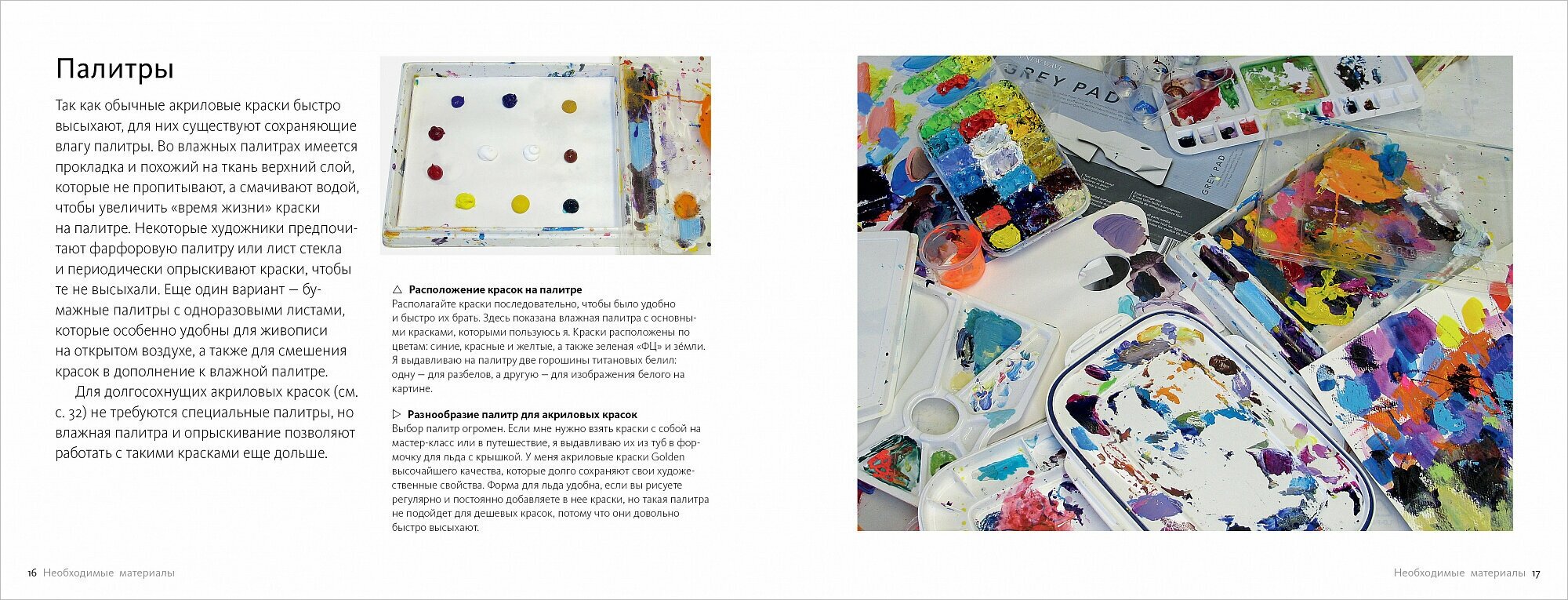«В акриловой живописи нет специального набора правил, поэтому художники могут творить свободно и с удовольствием. Акриловые краски идеально подходят для новичков, так как в процессе создания картины легко исправить ошибки, а опытным художникам эти краски, как ни один другой материал, предоставляют возможность раздвинуть границы. Акриловые краски, несомненно, самый универсальный материал, потому что в жидкой форме они напоминают акварель, а красками с более густой консистенцией можно писать, используя приемы масляной живописи. Тем не менее акриловые краски обладают свойствами, нехарактерными ни для акварели, ни для масляных красок. Поскольку акрил быстро сохнет, за короткий промежуток времени можно писать слой за слоем и добиться впечатляющих результатов всего за один сеанс. Я рада разделить с вами свое увлечение этим материалом и надеюсь, что изложенная в книге информация поможет вам разобраться в технике акриловой живописи за относительно короткое время». (Сорайя Френч)